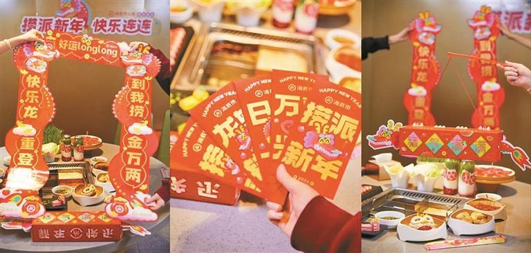 記者還發(fā)現(xiàn),多家連鎖餐飲品牌企業(yè)為新春推出的多款新品和趣味活動(dòng)都帶著龍騰虎躍的喜慶氛圍。西貝推出「生肖龍饃」「一桌年夜飯組合」「寶貝年菜大禮包」「草原牛羊禮盒」等年菜禮盒,硬核大菜、生肖主食、草原牛羊肉,一應(yīng)俱全。海底撈門店上新「蒸奇鬥豔」花饃、魚子福袋;而廣東海底撈火鍋部分門店還聯(lián)合中國(guó)郵政推出甲辰龍年明信片,顧客通過(guò)抽獎(jiǎng)獲得後,書寫的明信片可由門店協(xié)助寄出,為親友送上祝福,給龍年春節(jié)賦予見(jiàn)字如面的浪漫。