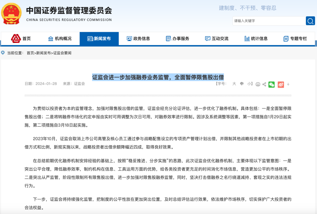 1月28日,證監(jiān)會官網(wǎng)發(fā)布《證監(jiān)會進(jìn)一步加強融券業(yè)務(wù)監(jiān)管,全面暫停限售股出借》一文,全文如下: