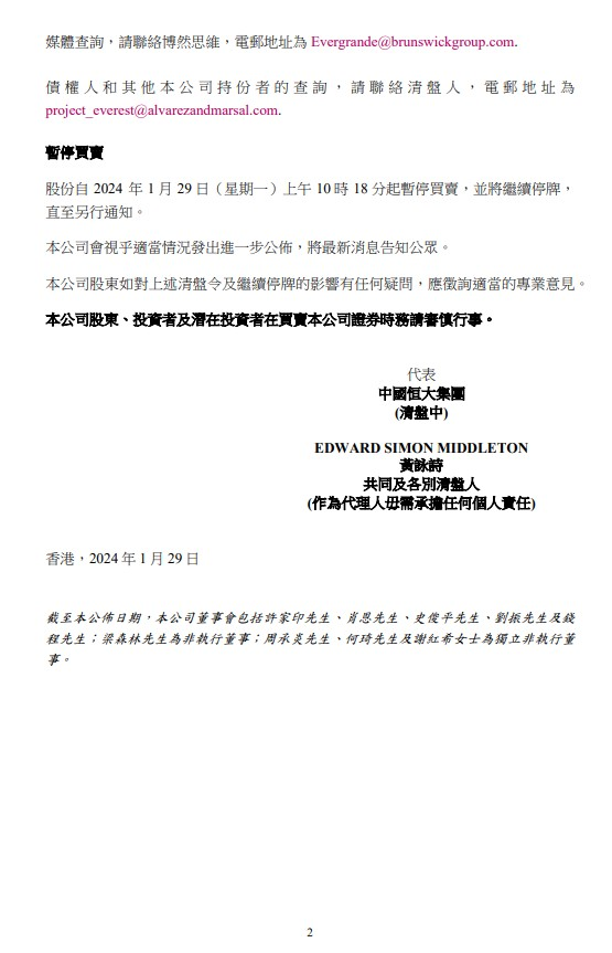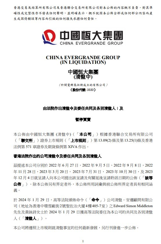 中國恒大在港交所發(fā)布公告稱,1月29日,高等法院頒布命令公司清盤。安邁顧問有限公司之Edward Simon Middleton及黃詠詩於2024年1月29日獲高等法院委任為公司的共同及各別清盤人。公司將遵照上市規(guī)則就清盤事宜的任何最新發(fā)展,另行刊發(fā)進(jìn)一步公布。