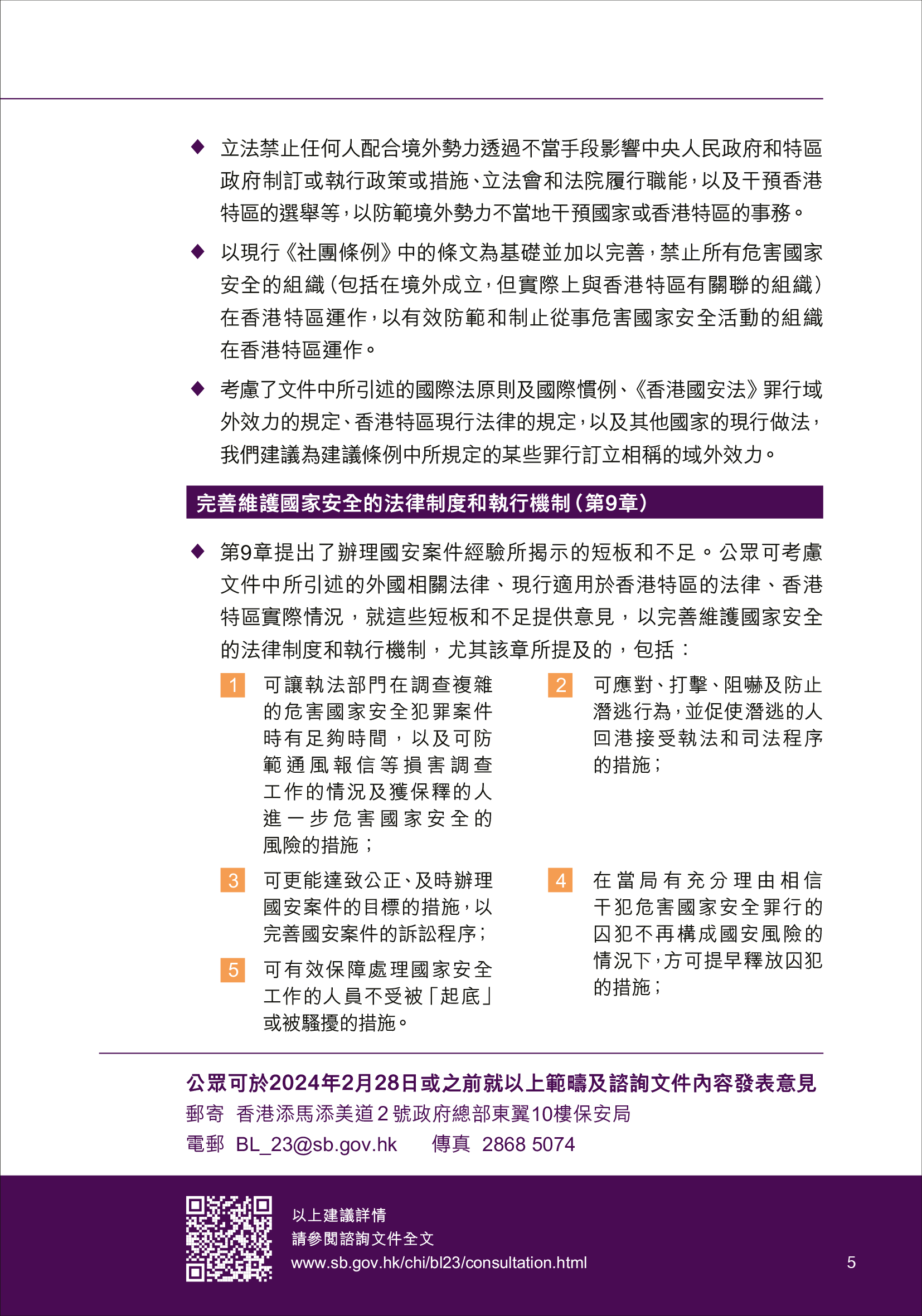 巿民可於2月28日或之前將意見電郵至BL_23@sb.gov.hk、傳真至2868 5074,或郵寄至香港添馬添美道2號(hào)政府總部東翼10樓保安局。諮詢文件的電子文本及相關(guān)的小冊(cè)子已上載至保安局網(wǎng)站的專題網(wǎng)頁(yè),網(wǎng)址如下:www.sb.gov.hk/chi/bl23/consultation.html,有需要的公眾人士亦可到各區(qū)民政事務(wù)處索取印刷文本。