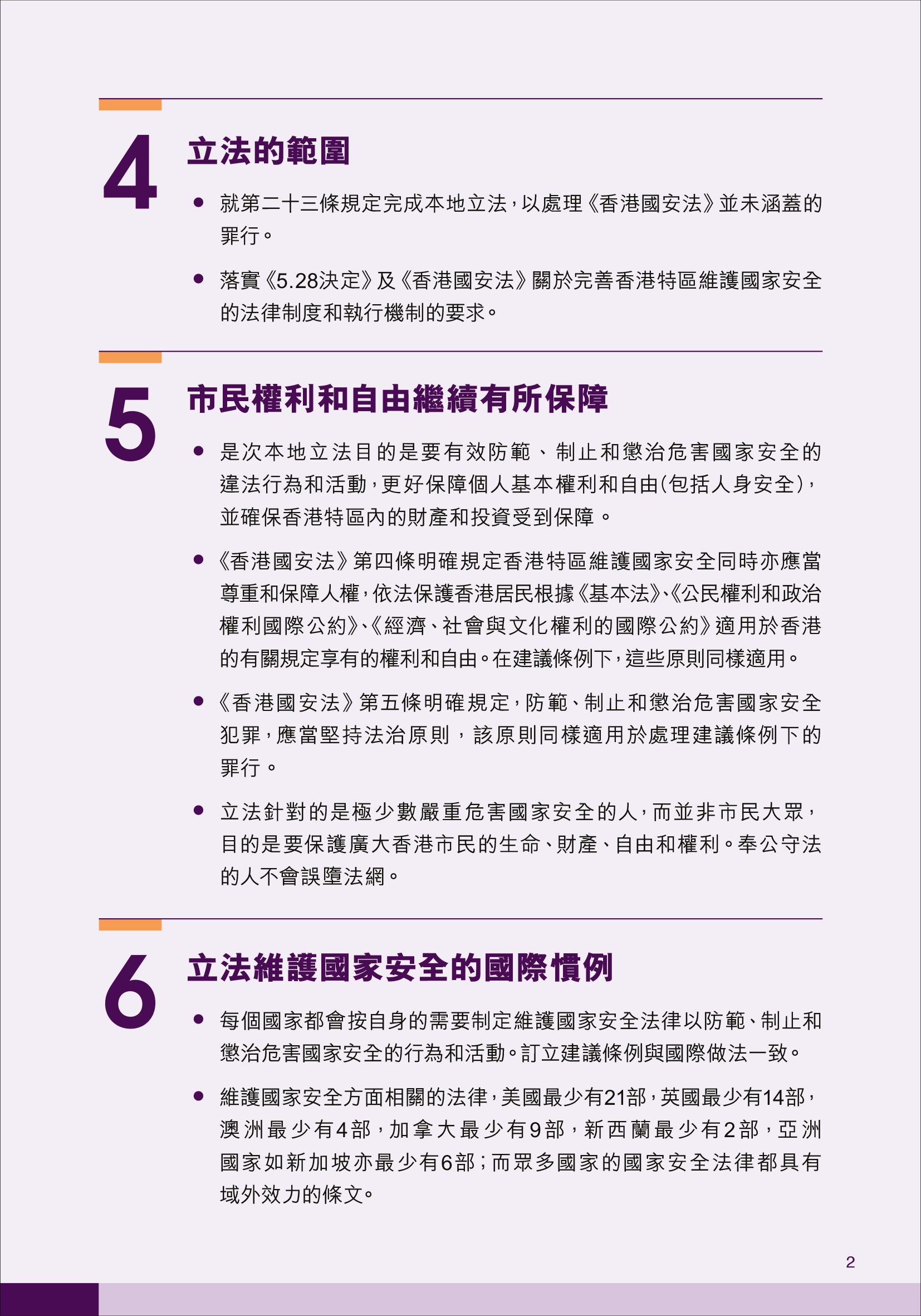 ●國(guó)家安全是社會(huì)繁榮穩(wěn)定、人民安居樂業(yè)的必要條件。落實(shí)《基本法》第二十三條立法,保障國(guó)家安全免受威脅,就能締造一個(gè)安穩(wěn)的環(huán)境,讓市民安居樂業(yè)、企業(yè)放心投資,並讓香港持續(xù)發(fā)展。第二十三條立法與全港市民的福祉息息相關(guān)。