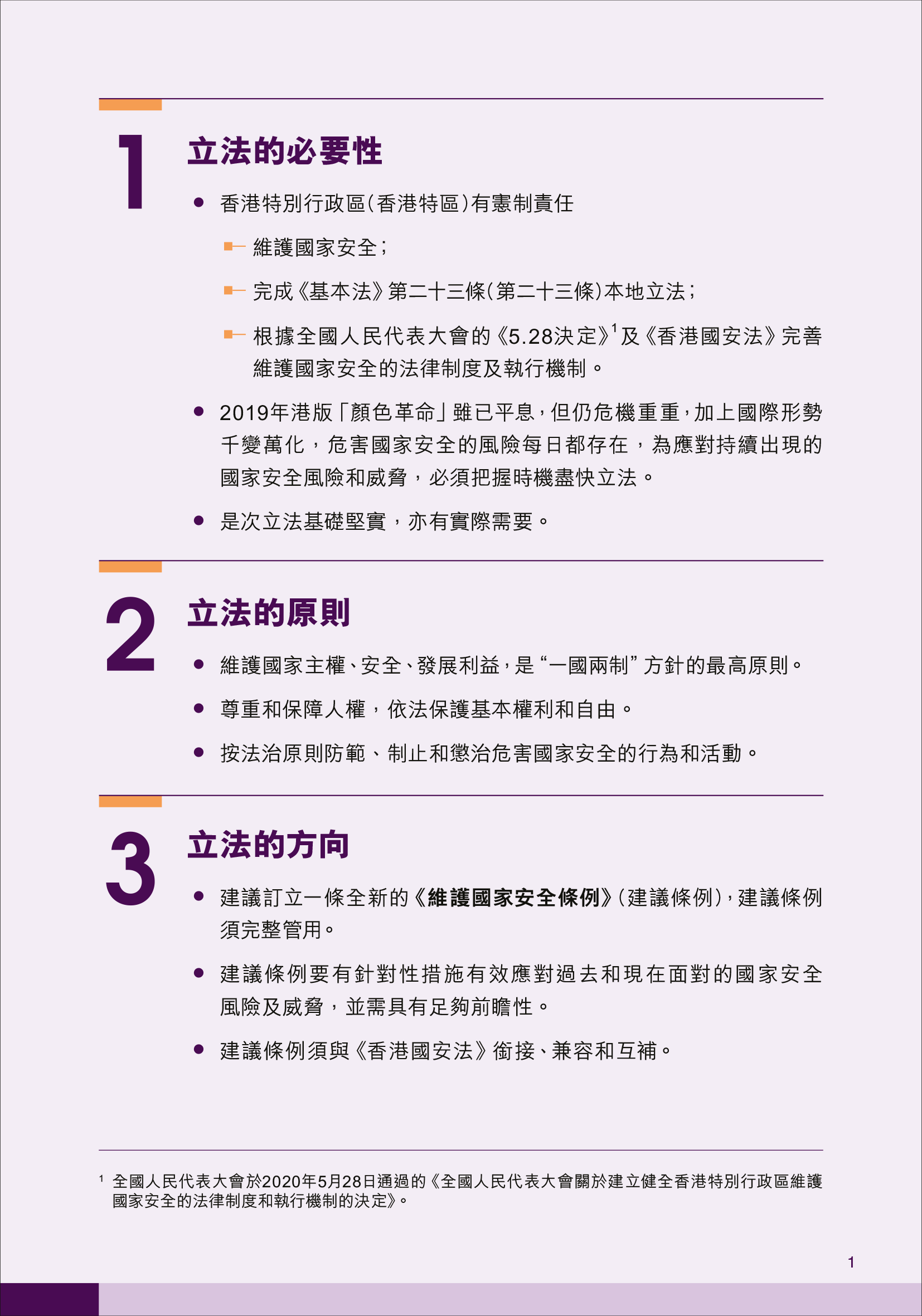 ●進(jìn)行第二十三條立法時(shí),香港特區(qū)有責(zé)任落實(shí)《5.28決定》[註]和《香港國(guó)安法》所規(guī)定的責(zé)任及義務(wù),完善香港特區(qū)維護(hù)國(guó)家安全的法律制度和執(zhí)行機(jī)制,以有效維護(hù)國(guó)家安全。