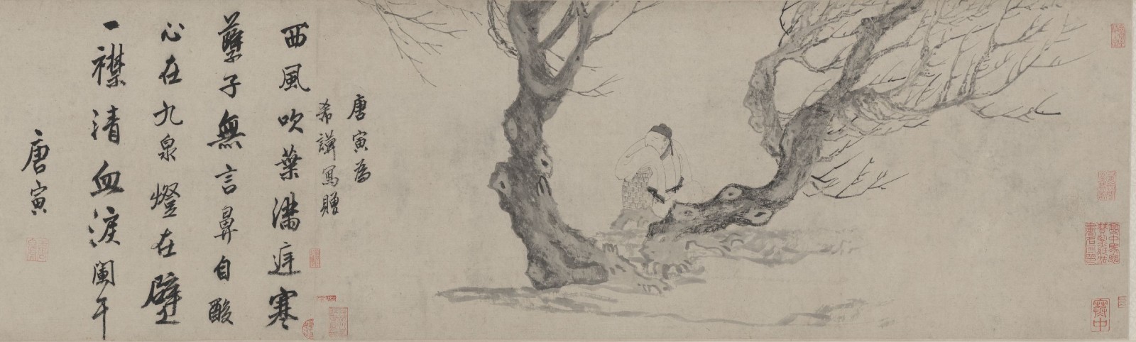 3月中旬展覽將輪換第二期展品,蔣方亭透露,屆時會展出唐寅所作、國家一級文物《風木圖》,「圖中描繪風中枯木兩株,一文士倚坐樹間,掩面哭泣,似在悲思故人。該畫純以水墨繪就,用筆精簡純熟,哀痛之情溢於筆墨之間,此卷還有題詩及鈐印,為唐寅詩書畫印合璧之作?!沽硪环裹c展品為晚明方宗所繪的《文姬歸漢圖》,「蔡文姬曾被匈奴俘虜,被贖回中原後幫忙整理父親遺稿,為保存和傳播中國文化作出了重要貢獻。這幅扇面畫描繪了蔡文姬歸漢前的場景,她身穿漢裝,舉目凝思,兩名幼子髡髮胡服在一旁玩耍,將文姬思念故國又不捨與幼子分離的兩難心境躍然紙上?!?/p>