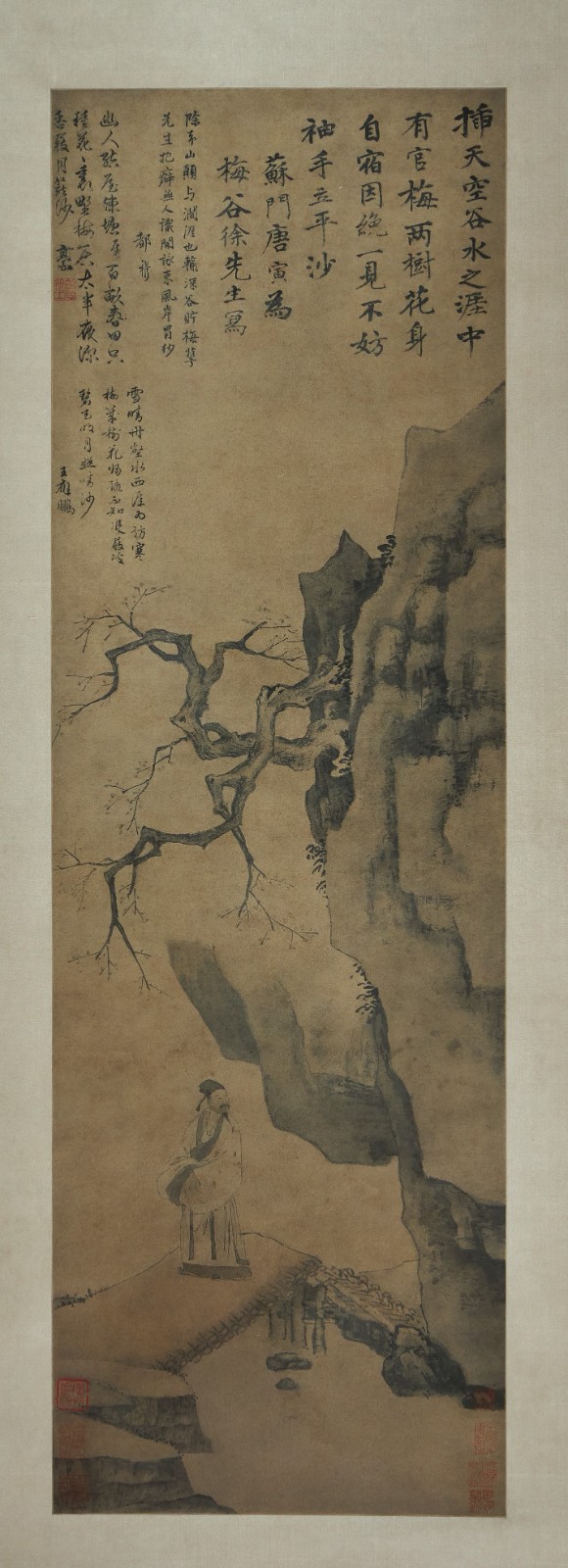 明朝祝允明、文徵明、唐寅及徐禎卿是為人熟知的「江南四才子」,是次展覽能一覽文徵明描繪王羲之《蘭亭集序》場景的作品《蘭亭修禊圖》與唐寅的《觀梅圖》,以及「吳派」代表人物仇英的作品。蔣方亭介紹,《觀梅圖》為首次境外展出,「《觀梅圖》中一位文士立於溪橋之上,兩株含苞待放的梅枝自危崖上向左下方伸展。策展時,我特意將此畫與張靈的《秋林高士圖》放在一起展出,觀眾可將兩者從主題、結(jié)構(gòu)、運筆等方面作對比,探索兩畫相似的原因,細味畫作背後的故事?!?/p>