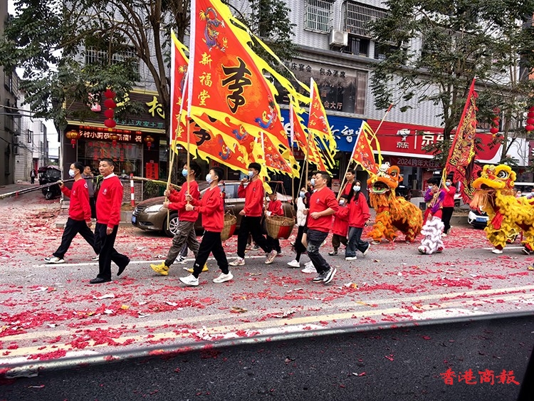 2月17日上午,記者來到該縣橫河鎮(zhèn)圩鎮(zhèn)看到,各村的買燈隊伍在激昂高亢的大鼓聲中走來,伴隨著鞭炮和大鼓的聲響,請花燈隊伍浩浩蕩蕩地遊行而過,每個村的買燈隊伍都足有上百人。買燈隊伍從村里來到圩鎮(zhèn)後,還會在鎮(zhèn)上走街串巷,給搬到鎮(zhèn)上居住的同姓村民拜年。
