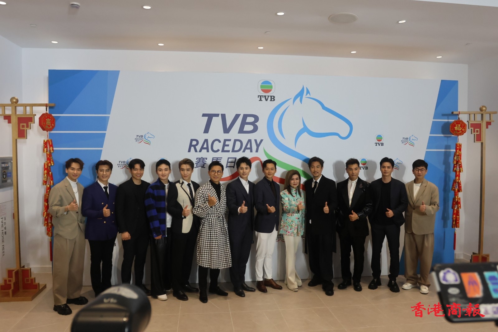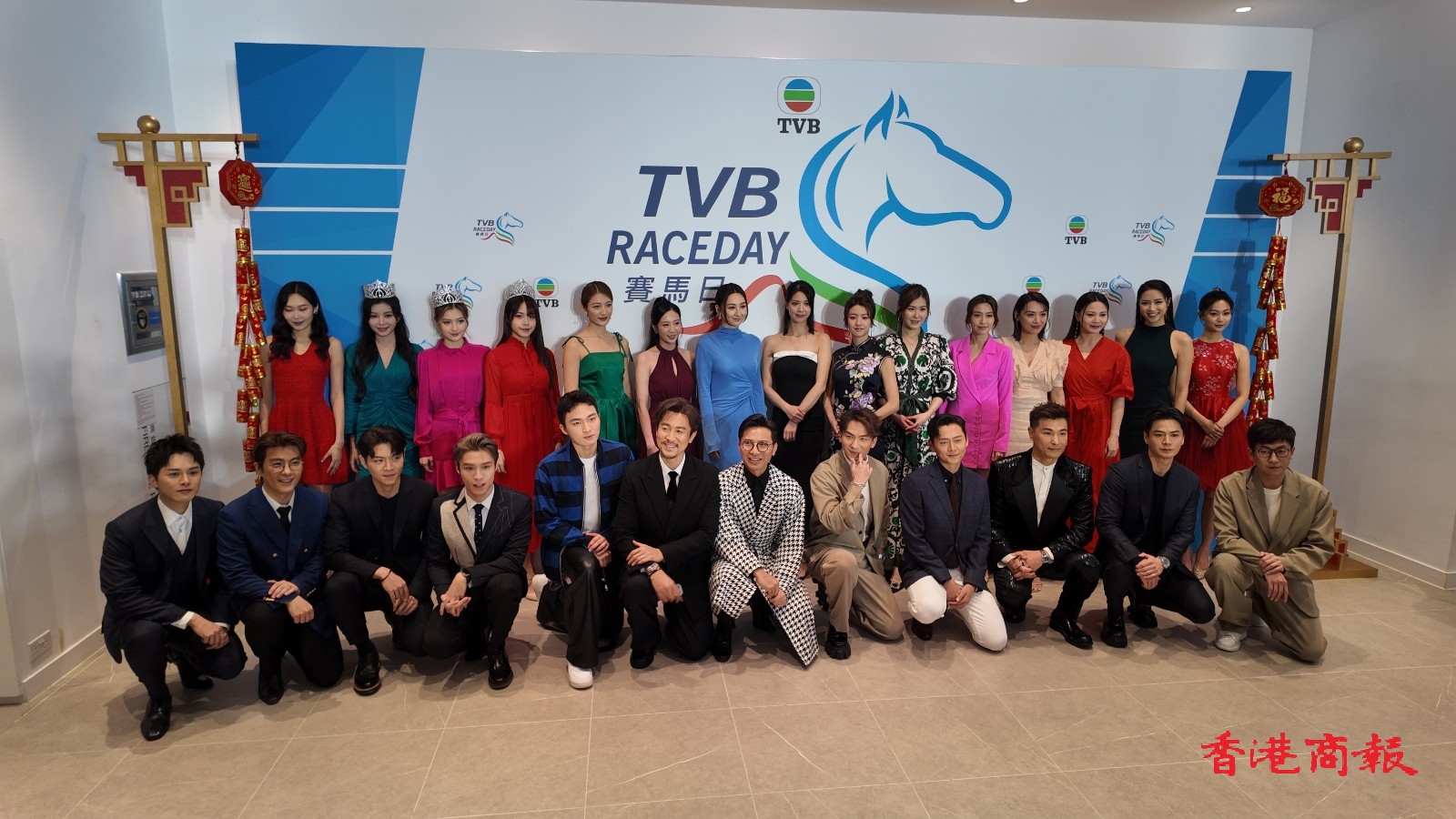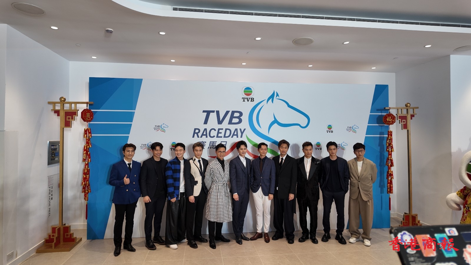 TVB行政主席許濤、總經(jīng)理(節(jié)目內容營運)曾志偉、總經(jīng)埋(業(yè)務營運)蕭世和,聯(lián)同逾30位TVB視星今日一早到場出席這個賽馬盛會,場面極為熱鬧,多位小生、花旦皆以盛裝登場,令人目不暇給,當中有陳展鵬、高海寧、羅子溢、譚俊彥、姚子羚、陳煒、朱晨麗、劉穎鏇、劉佩玥、蔡思貝、丁子朗、郭柏妍、何廣沛、金城安等人。而在賽事開跑前,一眾小生、花旦一齊步出會員席廂座的傳媒區(qū)讓記者拍照,並且來張大合照。當中高海寧穿上粉藍色長裙,顯出驕人身材,搶盡風頭。而劉穎鏇著上深綠色露背長裙,同樣有睇頭。