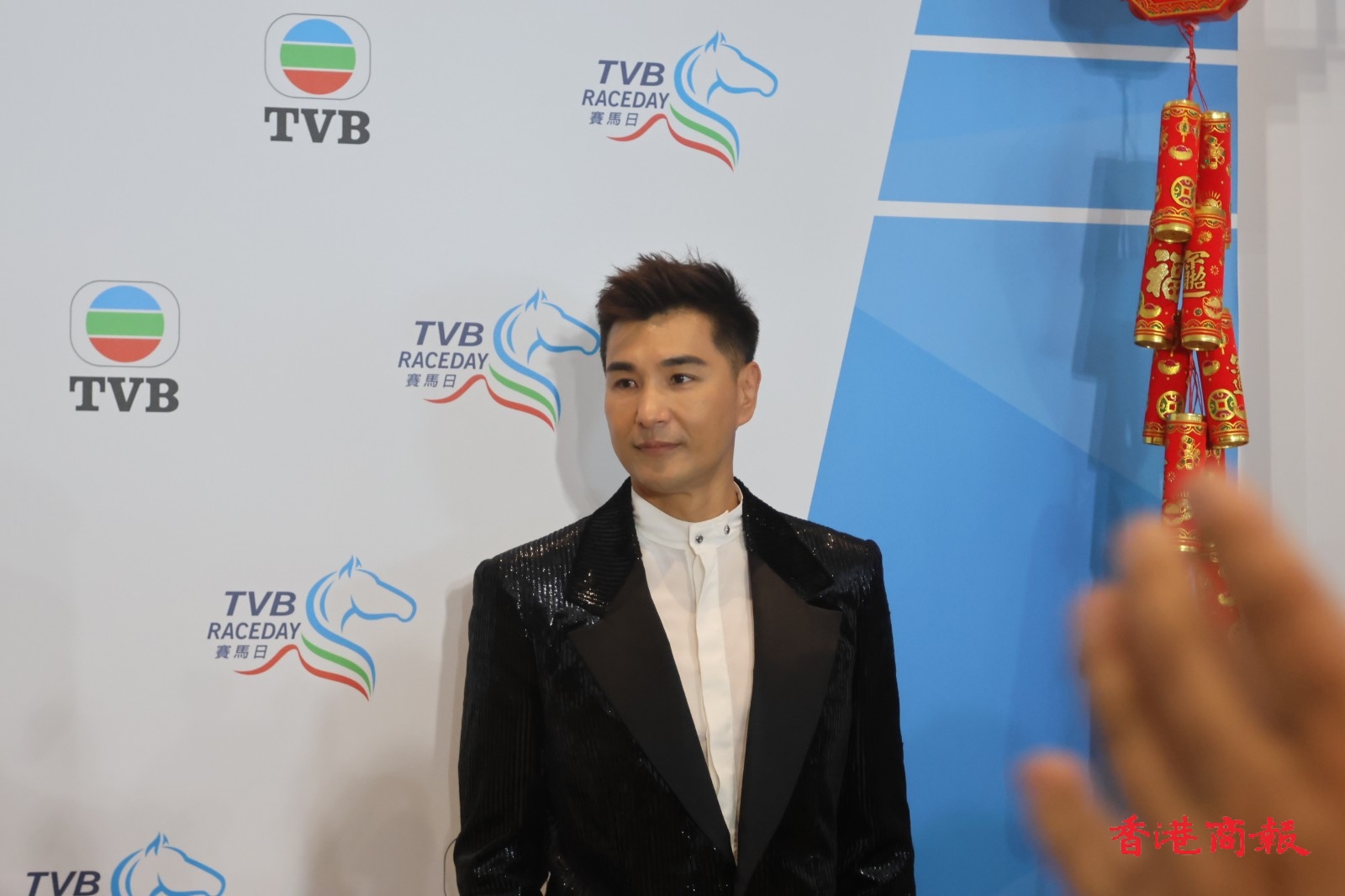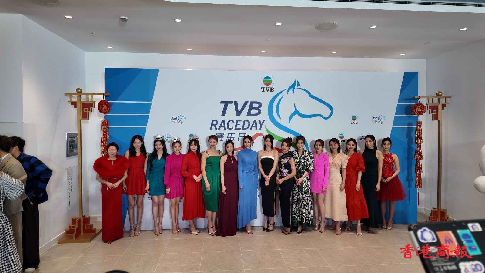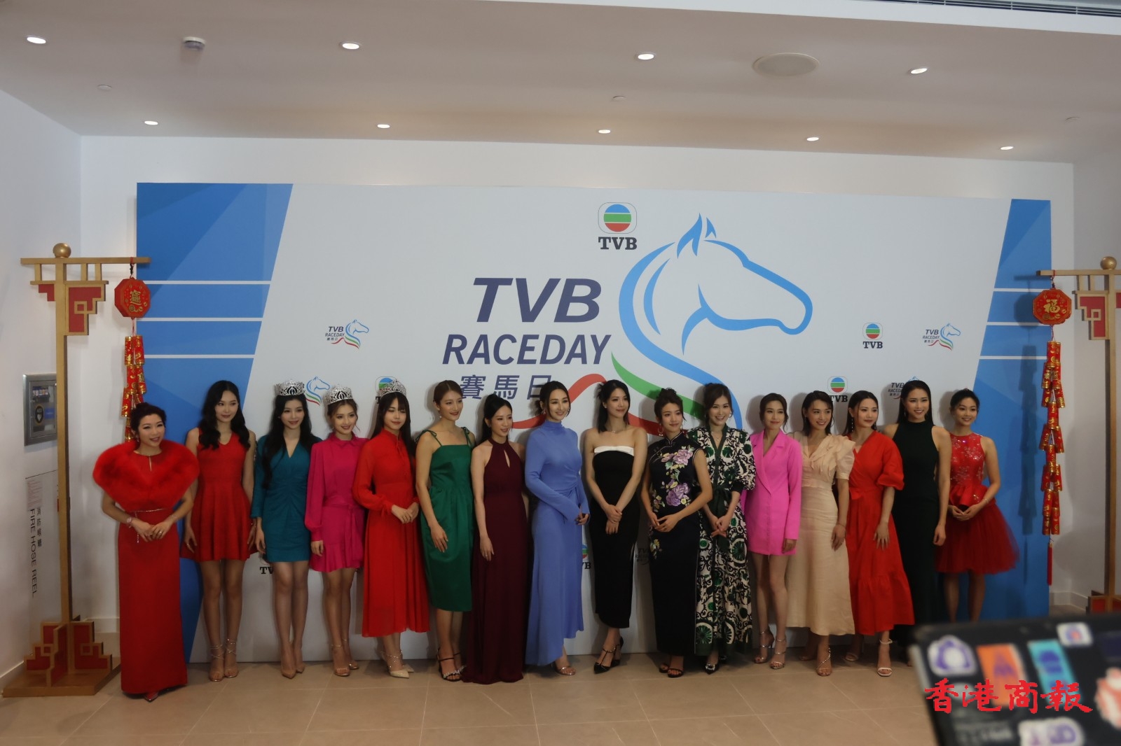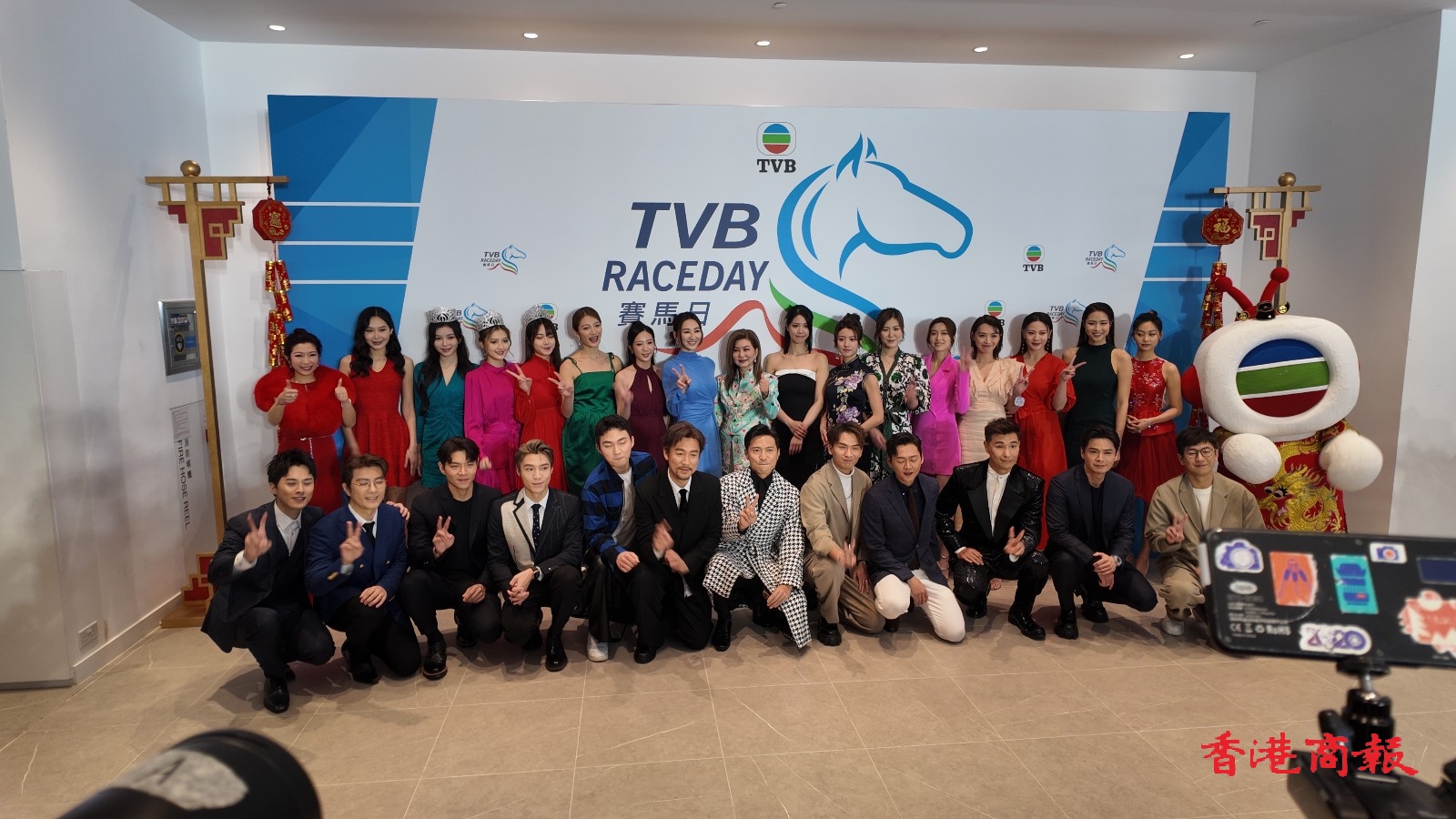 TVB行政主席許濤、總經(jīng)理(節(jié)目內容營運)曾志偉、總經(jīng)埋(業(yè)務營運)蕭世和,聯(lián)同逾30位TVB視星今日一早到場出席這個賽馬盛會,場面極為熱鬧,多位小生、花旦皆以盛裝登場,令人目不暇給,當中有陳展鵬、高海寧、羅子溢、譚俊彥、姚子羚、陳煒、朱晨麗、劉穎鏇、劉佩玥、蔡思貝、丁子朗、郭柏妍、何廣沛、金城安等人。而在賽事開跑前,一眾小生、花旦一齊步出會員席廂座的傳媒區(qū)讓記者拍照,並且來張大合照。當中高海寧穿上粉藍色長裙,顯出驕人身材,搶盡風頭。而劉穎鏇著上深綠色露背長裙,同樣有睇頭。