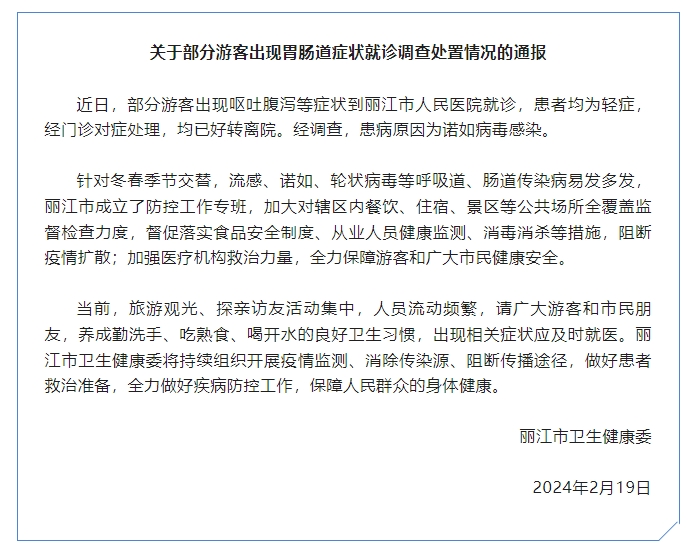 2月19日,麗江市衛(wèi)生健康委在其官微發(fā)布《關於部分遊客出現(xiàn)胃腸道癥狀就診調查處置情況的通報》: