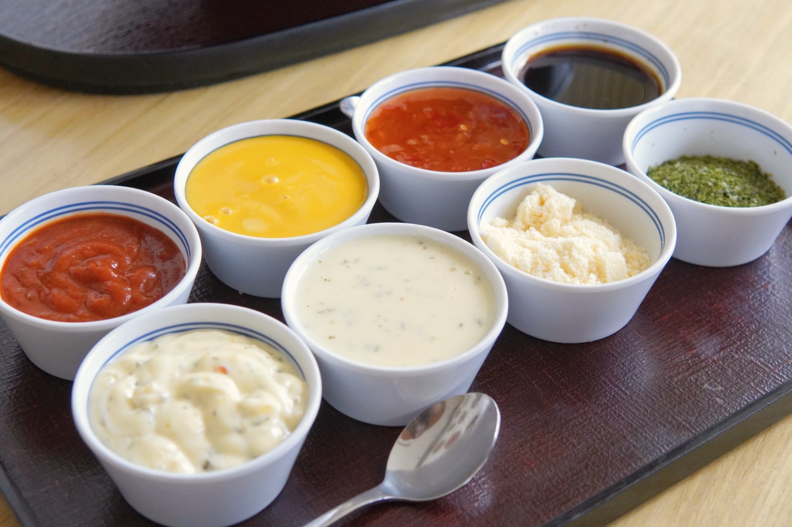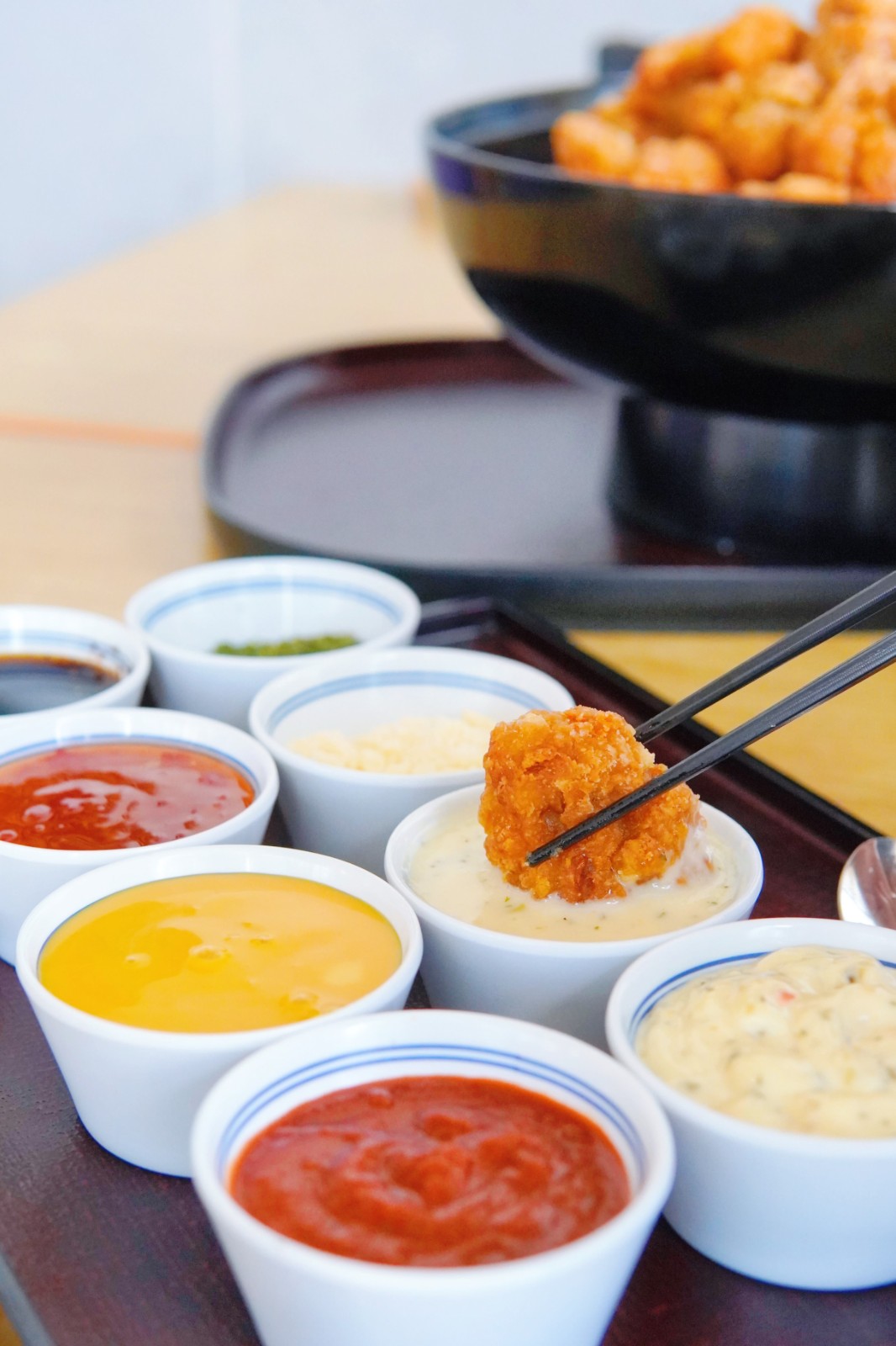 8款醬汁包括經(jīng)典的南蠻汁、他他醬、蜜糖芥末醬、特調(diào)南蠻他他汁、泰式雞醬、薄餅醬、芝士粉及海苔。