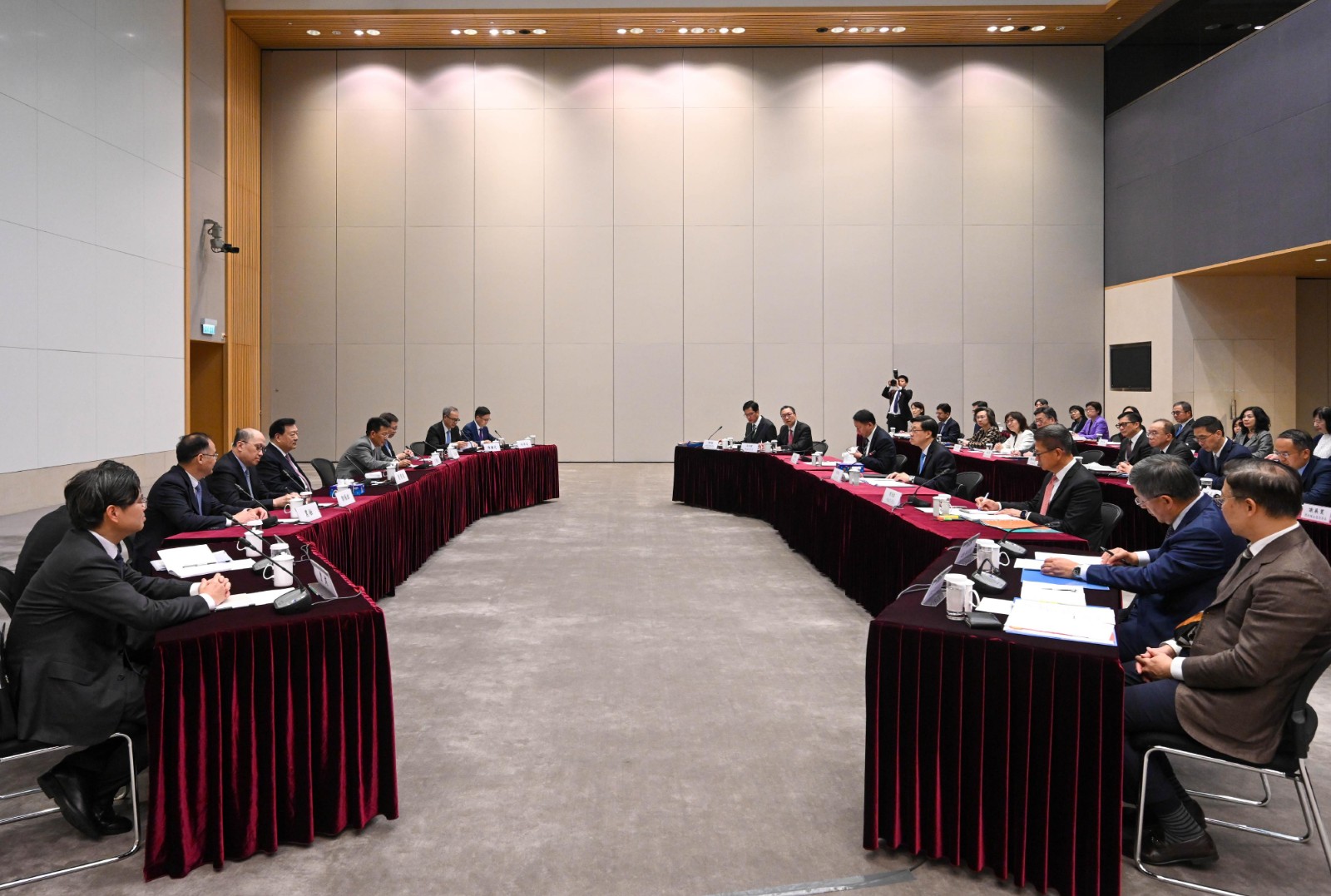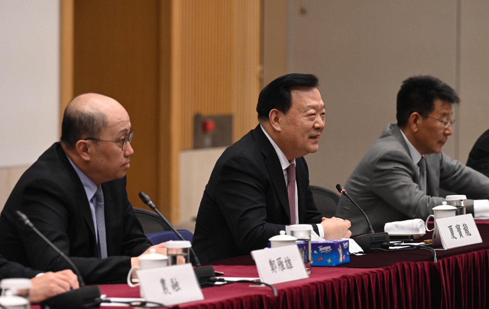 夏寶龍(中)下午與行政長官李家超率領(lǐng)的特區(qū)政府全體主要官員及常任秘書長進(jìn)行座談交流。政府新聞處