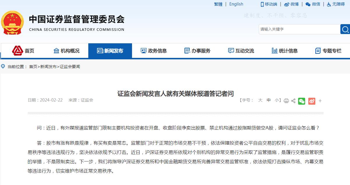 證監(jiān)會新聞發(fā)言人表示,股市有漲有跌是規(guī)律,有買有賣是常態(tài)。監(jiān)管部門對於正常的市場交易不干預(yù),依法保障投資者公平自由交易的權(quán)利,對於擾亂市場交易秩序等違法違規(guī)行為,堅決依法依規(guī)予以打擊。近日,滬深證券交易所依規(guī)對個別機構(gòu)的異常交易行為採取了監(jiān)管措施,是履行交易監(jiān)管職責(zé)的舉措,不是限制賣出。下一步,我們將指導(dǎo)滬深證券交易所和中國金融期貨交易所完善異常交易監(jiān)管標(biāo)準(zhǔn),依法依規(guī)打擊操縱市場、內(nèi)幕交易等違法行為,切實維護(hù)市場正常交易秩序。