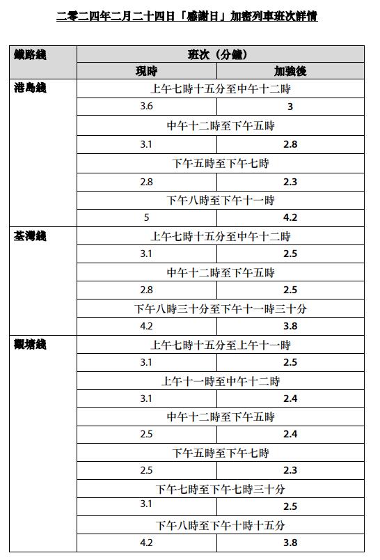 「感謝日」當(dāng)天,6條港鐵路線,包括港島線、南港島線、荃灣線、觀塘線、屯馬線及東鐵線會加密班次,合共增加370班車,輕鐵亦會行駛更多雙卡車輛增加載客量。
