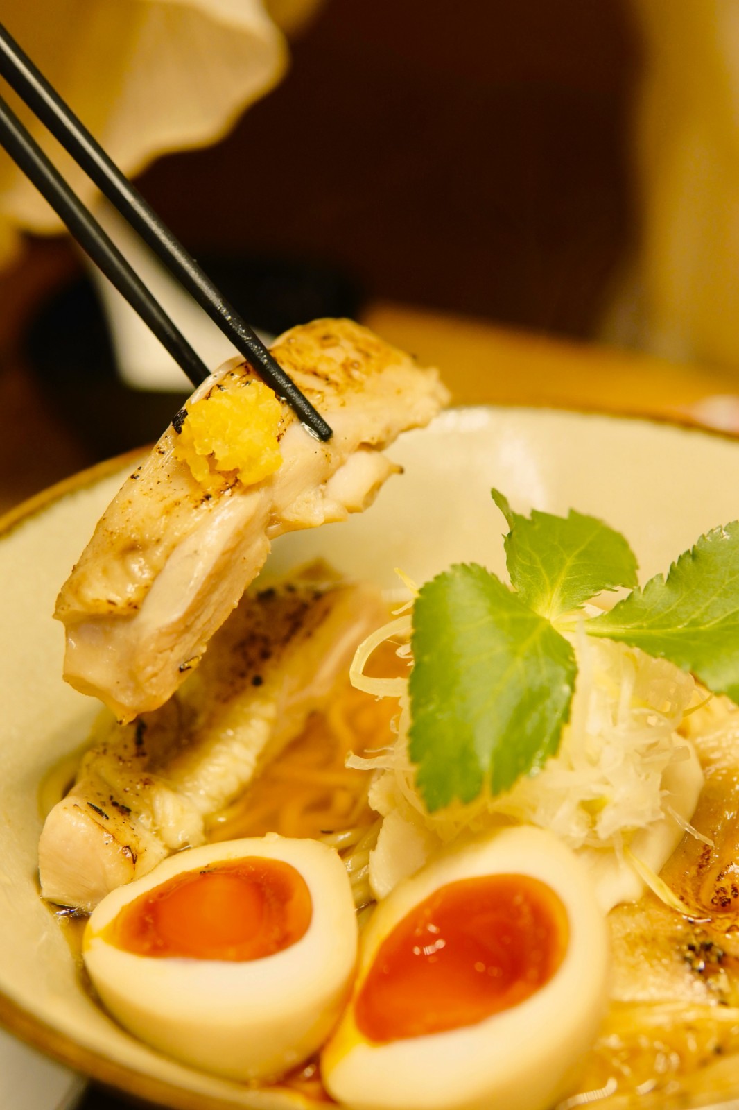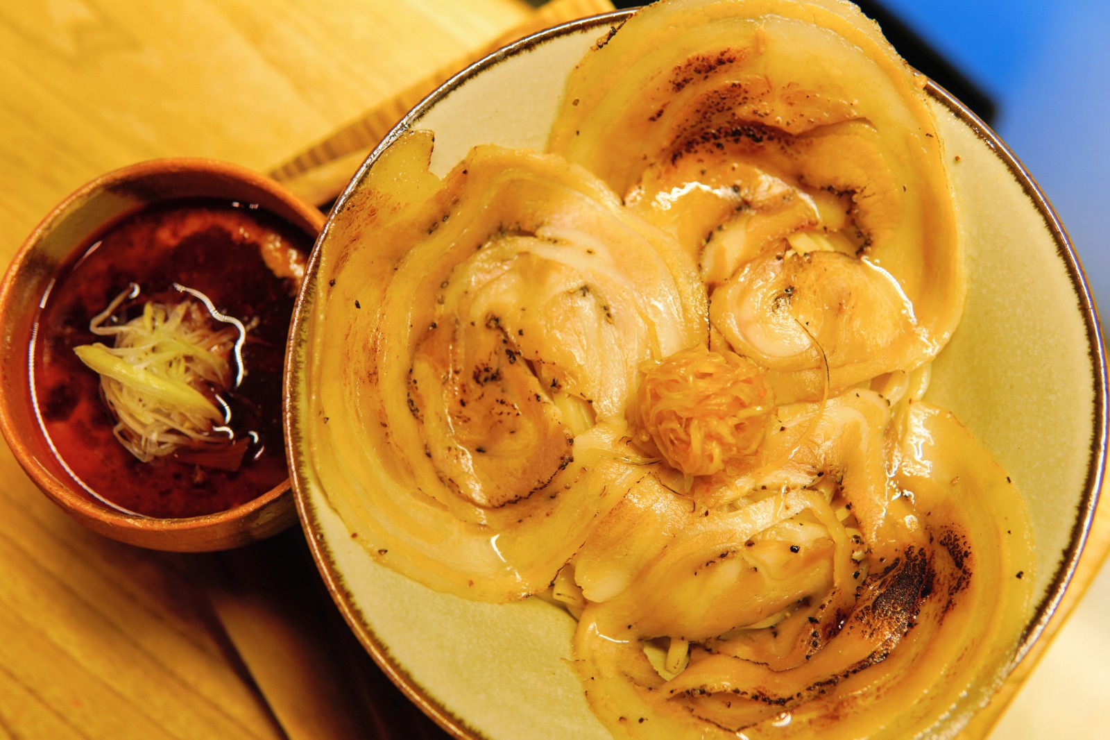 肉食愛好者可選擇「雞醬油拉麵」,湯底採用日本產(chǎn)雞和醬油及味醂醃製的新鮮花蛤及蛤蜊,取其鮮香味美,拉麵特別之處在於搭配了三款叉燒,包括「柚子雞叉燒」以柚子皮醃製阿波尾雞胸肉,口感清新;「香草火炙雞叉燒」阿波尾雞腿肉以日本巖鹽、胡椒、百里香、芹菜和大蒜醃製,雞肉保留雞皮以火炙燒,肉質(zhì)香嫩多汁;「火炙北海道十勝豚肉」,梅頭肉以雞貝鹽及雞醬油醃製,為拉麵注入豐盛滋味。 (記者、部分圖片:Janice)