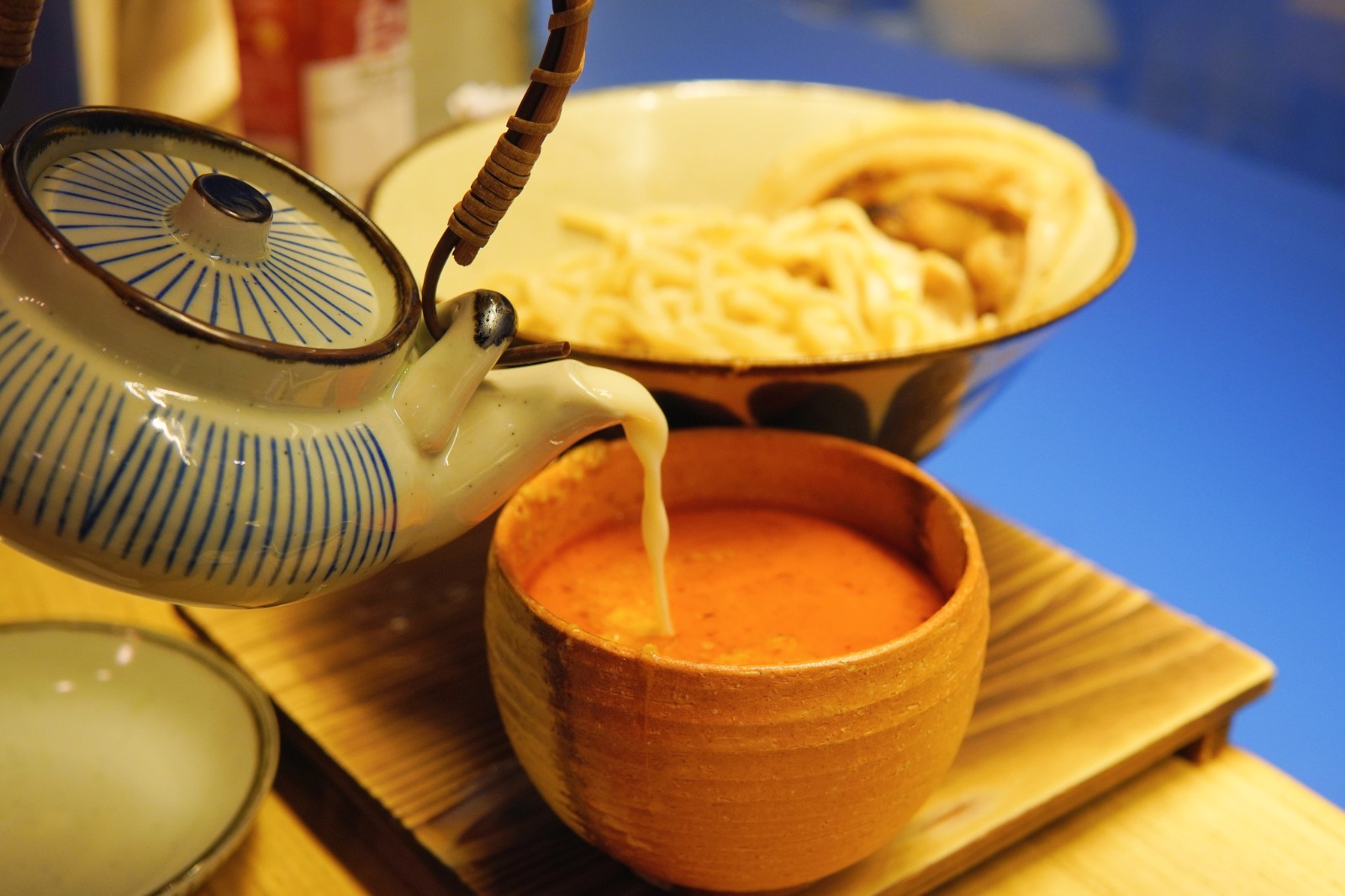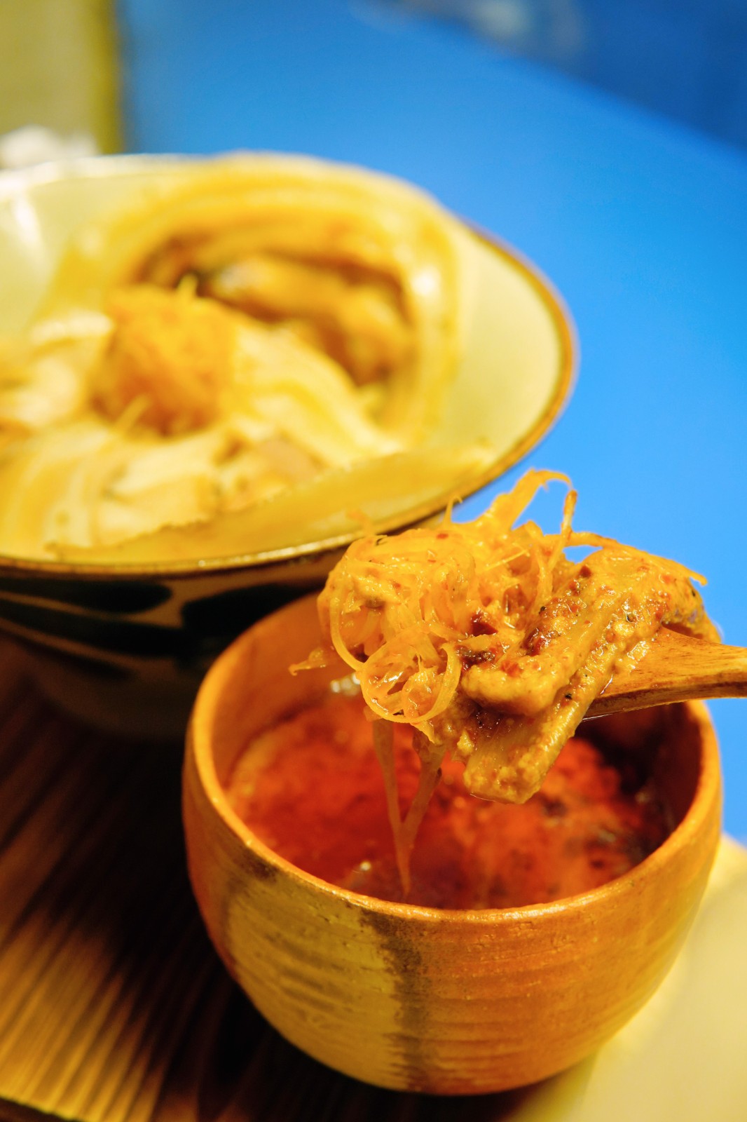嗜辣者推介「火炙豚肉擔(dān)擔(dān)沾麵」,粗麵條選用日本小麥粉製作,濃郁的雞白湯與芝麻味噌醬熬製而成的沾麵醬汁相結(jié)合,風(fēng)味獨(dú)特。芝麻味噌醬的芝麻經(jīng)輕微烘焙、多次磨碎,展現(xiàn)香氣和順滑口感,同時(shí)用上京都、德島及信州多地味噌,調(diào)配出複雜有致的味噌。沾麵搭配3片火炙豚肉叉燒,以北海道十勝豚梅頭肉經(jīng)低溫?zé)h製四小時(shí)而成,脂肪比例均勻、肉質(zhì)鮮嫩,加入甜辣京蔥作點(diǎn)綴。把麵吃完後,剩下的沾湯可加上豆乳製成「湯割」享用,以沾湯、豆乳約一比一的比例混合,充分品味稀釋後的湯底滋味。