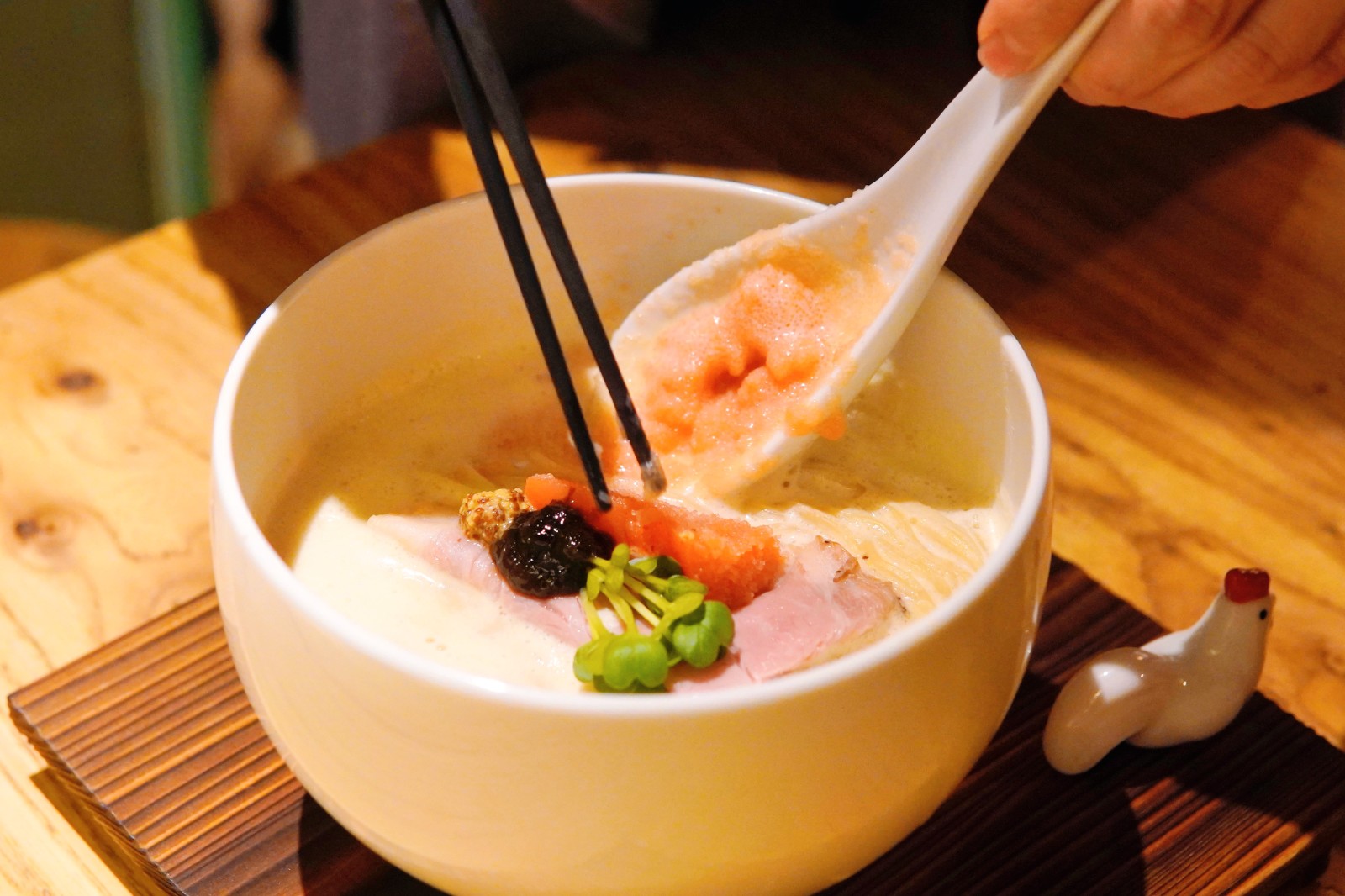 「明太子豆乳雞白湯拉麵」,HK$158。湯底來自京都的丹波地雞熬製而成,綴以松露油,配料包括北海道十勝豚肉、博多明太子及巖海藻和芥末粒。