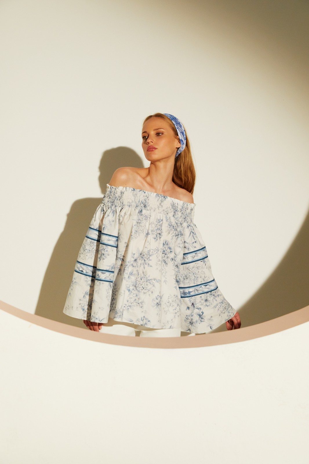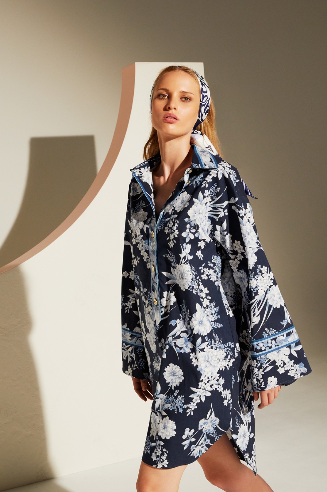 簡約、優(yōu)雅的服裝線條搭配淺藍色印花,適合海島度假穿搭。