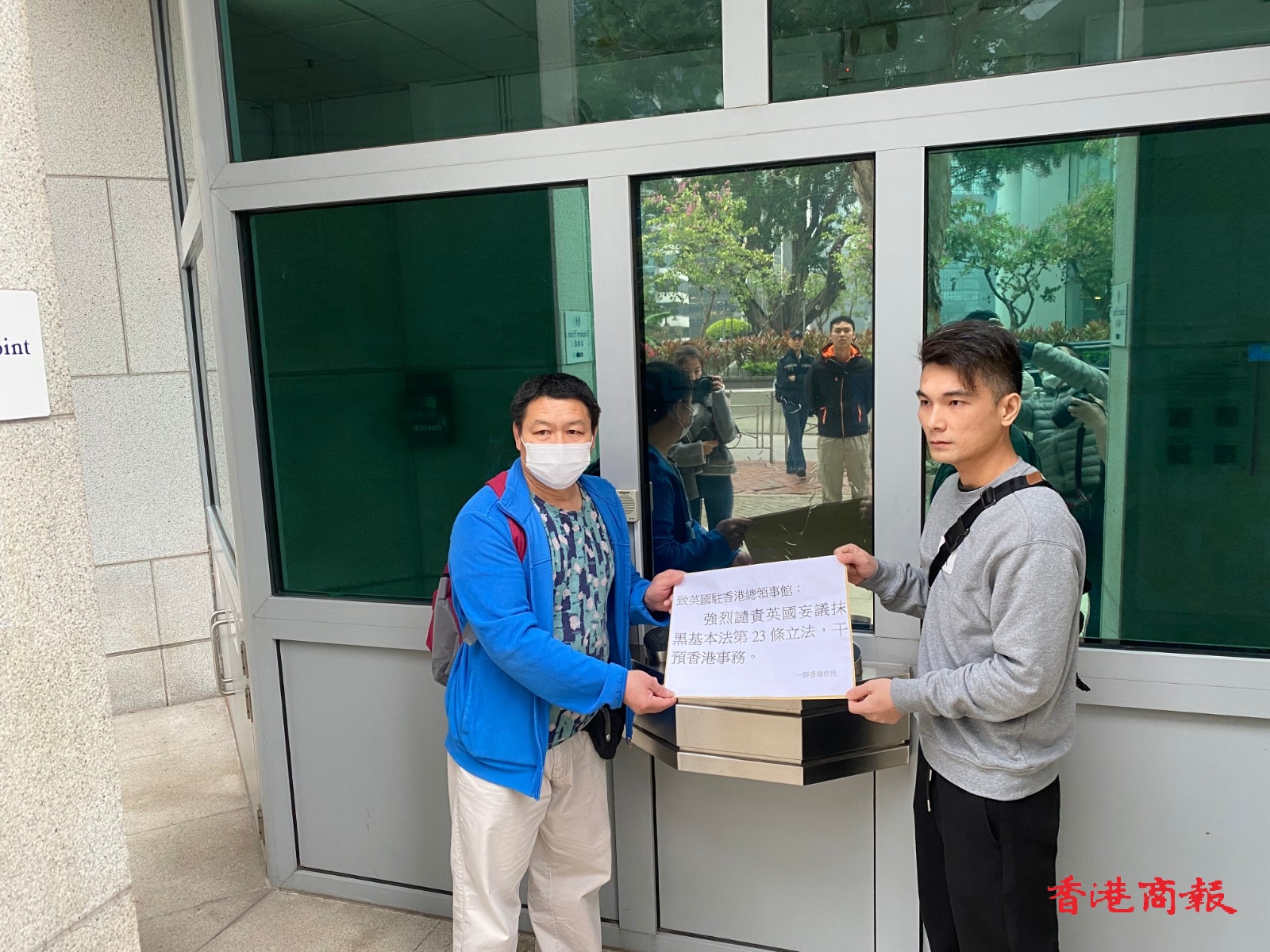 頂圖:香港東區(qū)各界協(xié)會一行20多人到英國駐港澳總領(lǐng)事館抗議。