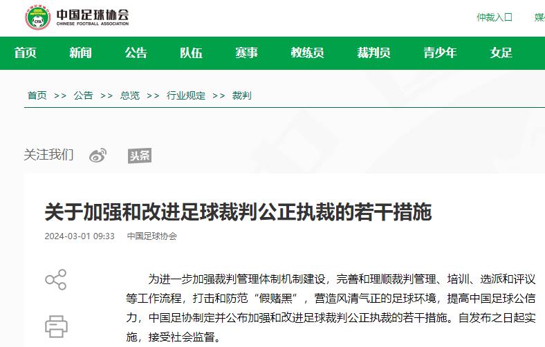 為進(jìn)一步加強(qiáng)裁判管理體制機(jī)制建設(shè),完善和理順裁判管理、培訓(xùn)、選派和評(píng)議等工作流程,打擊和防範(fàn)「假賭黑」,營(yíng)造風(fēng)清氣正的足球環(huán)境,提高中國(guó)足球公信力,中國(guó)足協(xié)制定並公布加強(qiáng)和改進(jìn)足球裁判公正執(zhí)裁的若干措施。自發(fā)布之日起實(shí)施,接受社會(huì)監(jiān)督。