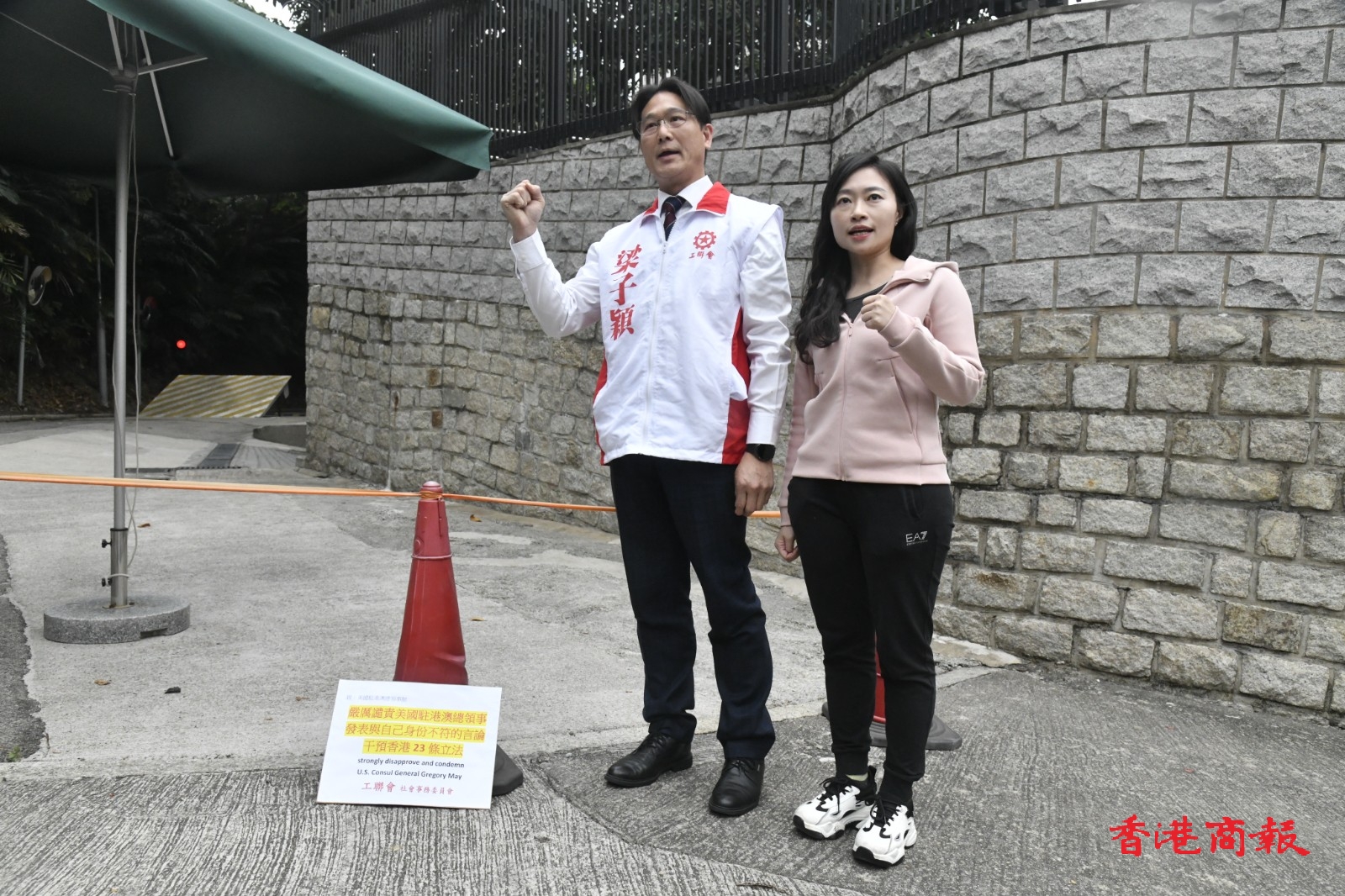 工聯(lián)會(huì)一批代表到美國駐港澳總領(lǐng)事館抗議美方抹黑基本法23條立法。(記者蔡啟文攝)