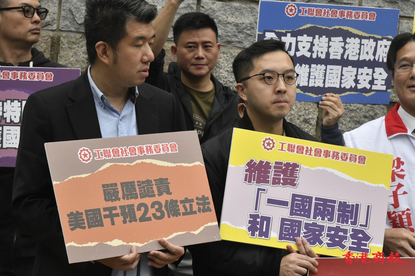 工聯(lián)會(huì)立法會(huì)議員鄧家彪、梁子穎和陳穎欣,聯(lián)同工聯(lián)會(huì)社會(huì)事務(wù)委員會(huì)(社委)及工會(huì)代表一行20多人,今日(7日)下午到美國駐港澳總領(lǐng)事館抗議,強(qiáng)烈譴責(zé)美國駐港澳總領(lǐng)事攻擊抹黑香港國安法和23條立法,干預(yù)特區(qū)政府維護(hù)國家安全。