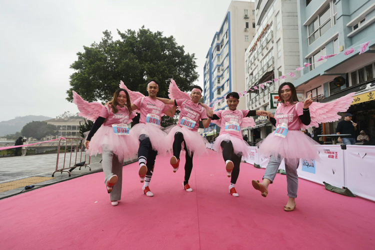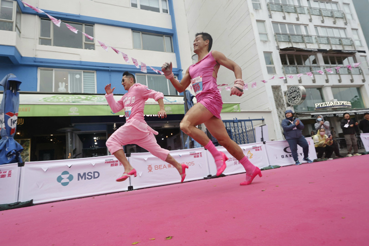 10日下午舉行的粉紅高踭鞋慈善賽,不論男女均穿上粉紅高踭鞋,大步向前跑。