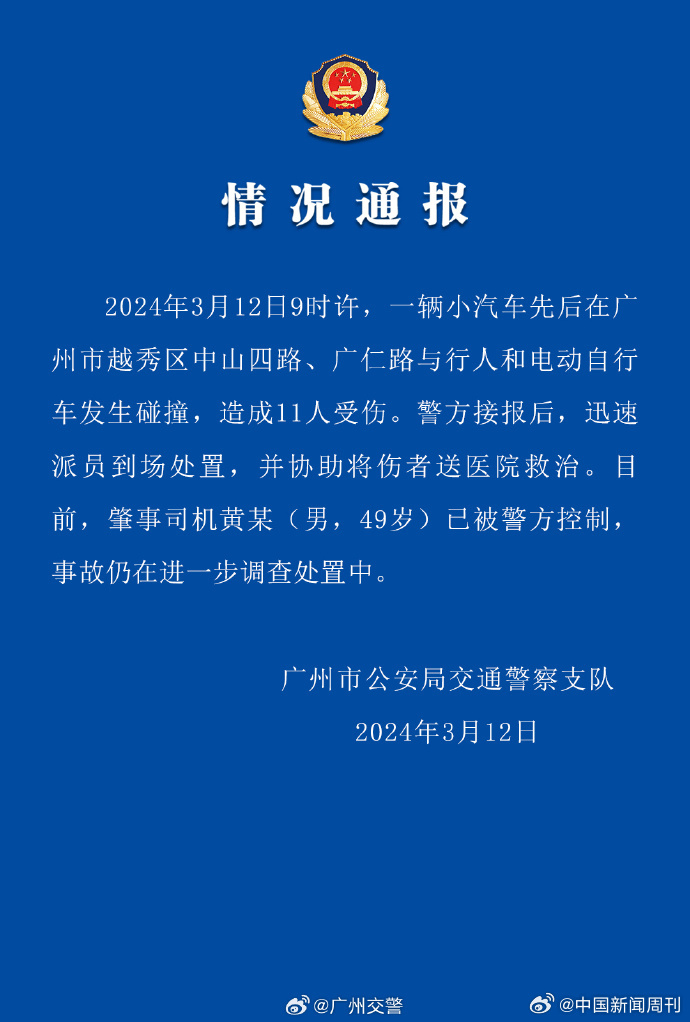 2024年3月12日9時(shí)許,一輛小汽車先後在廣州市越秀區(qū)中山四路、廣仁路與行人和電動(dòng)自行車發(fā)生碰撞,造成11人受傷。警方接報(bào)後,迅速派員到場(chǎng)處置,並協(xié)助將傷者送醫(yī)院救治。目前,肇事司機(jī)黃某(男,49歲)已被警方控制,事故仍在進(jìn)一步調(diào)查處置中。