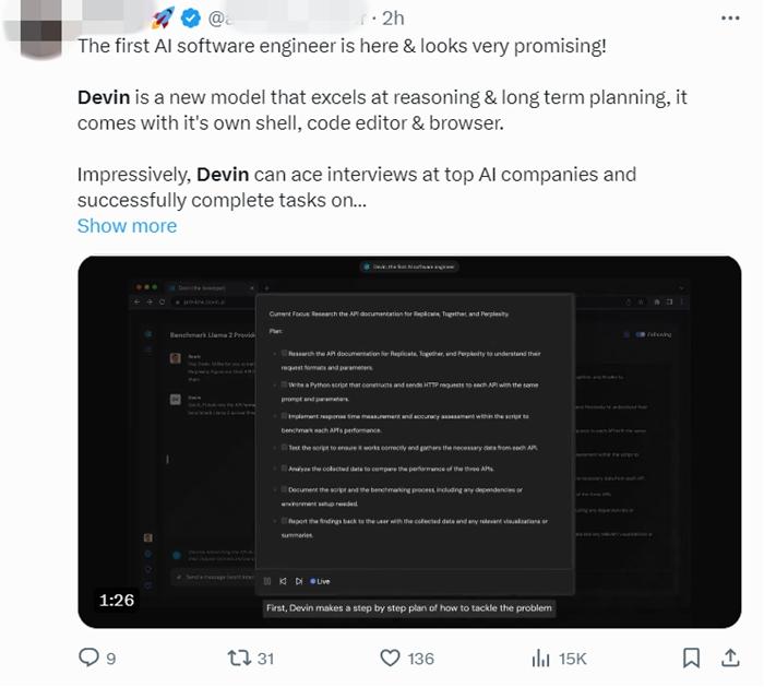 「第一位AI工程師看起來很有希望,令人印象深刻的是,Devin可以在頂級AI公司的面試中脫穎而出,並且成功地完成了任務(wù)?!褂腥斯ぶ悄軐<以谏缃黄脚_分享觀點。多個Devin編程的視頻也在網(wǎng)絡(luò)流傳。