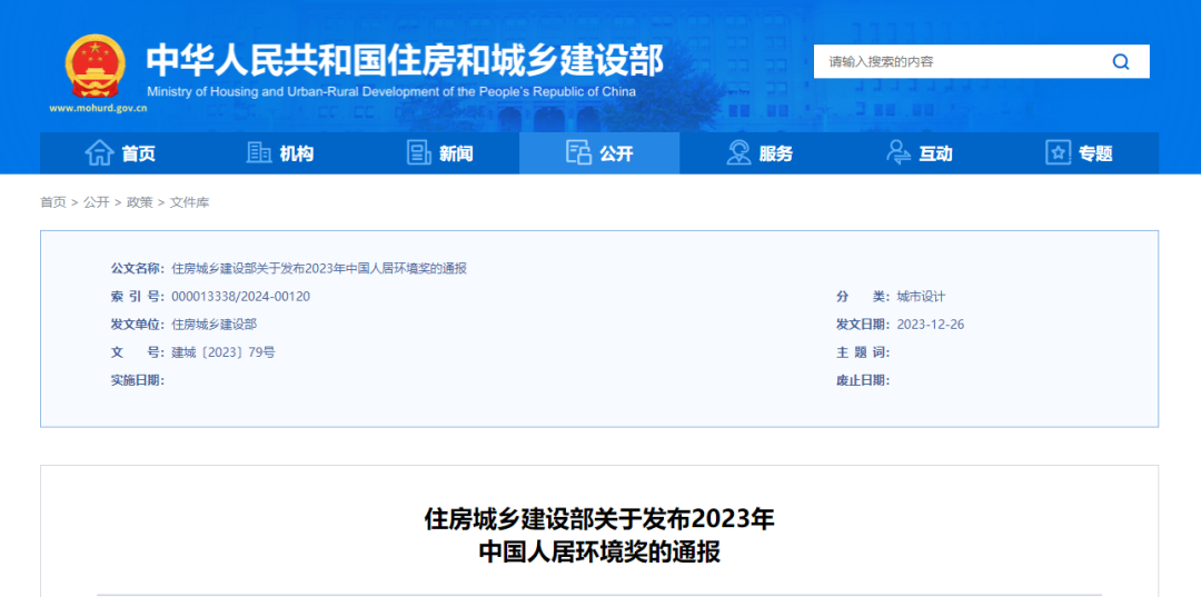 《關(guān)於發(fā)布2023年中國人居環(huán)境獎的通報》