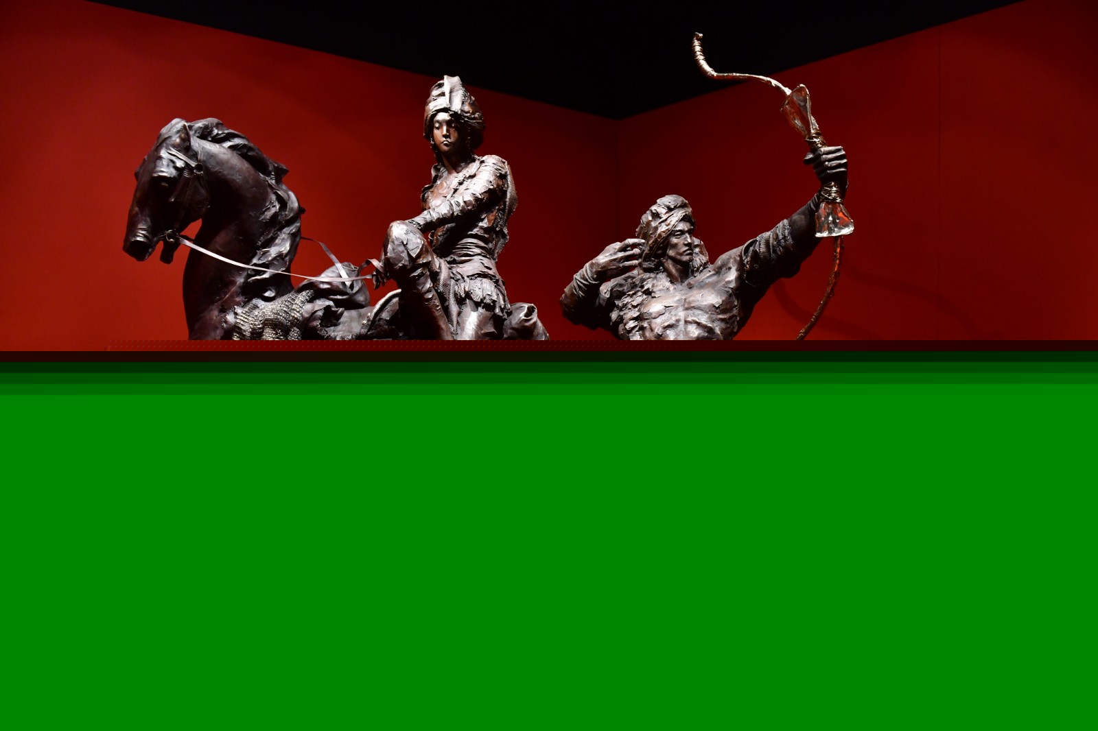 金庸的小說雖是虛構、書寫古代題材,卻處處滲透現(xiàn)代精神,寫出了真實的人性,把人物刻劃得栩栩如生,因而備受世界華人追捧。如展覽廳入口處展示的郭靖與黃蓉,任哲選以角色年輕時的形象創(chuàng)作。以竹刀勾勒寥寥數(shù)筆,黃蓉古銅色小乞丐的嬌俏形象便躍現(xiàn)眼前,策馬而行的姿態(tài),恍如勇敢追逐理想;雕像郭靖凝視天際長空,一臂執(zhí)弓,一臂扣絃,引弓的寫意動作展現(xiàn)其堅毅、豪邁的神態(tài)。在小說中,郭靖天資魯鈍,但忠義善良,是金庸筆下「為國為民,俠之大者」的英雄人物,展覽主題「俠之大者」一詞亦是出自《神鵰俠侶》中郭靖對楊過的一番寄語。任哲表示,希望通過自己的雕塑作品,傳達金庸想表達的情感。