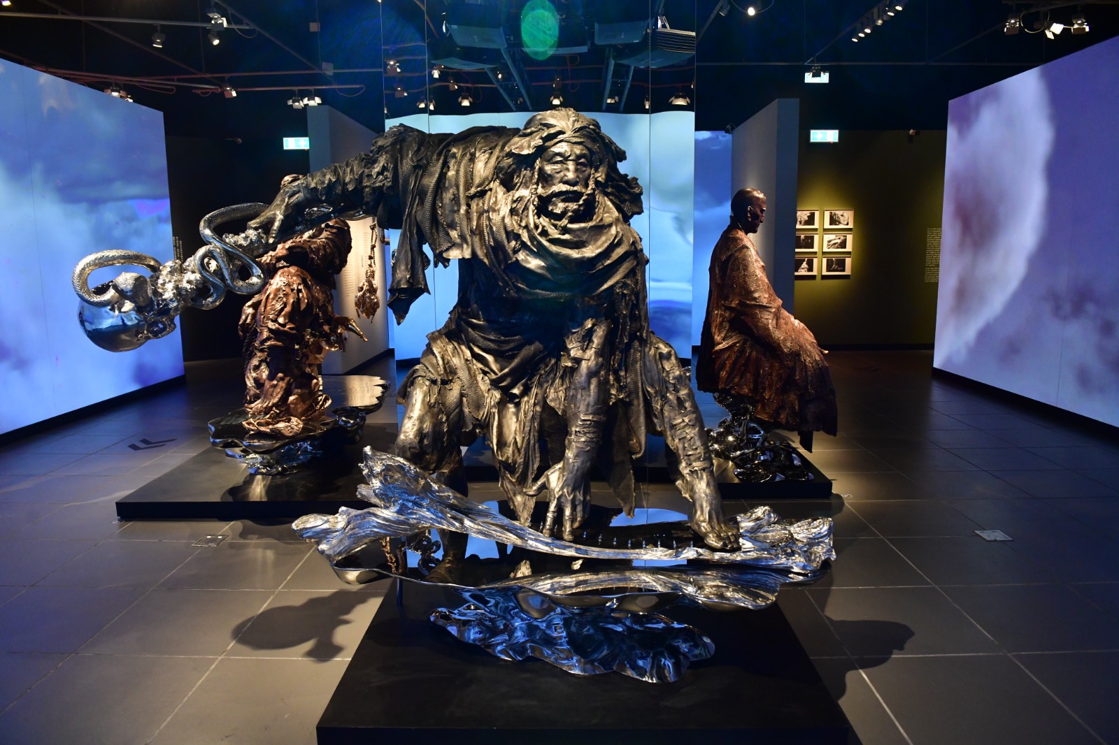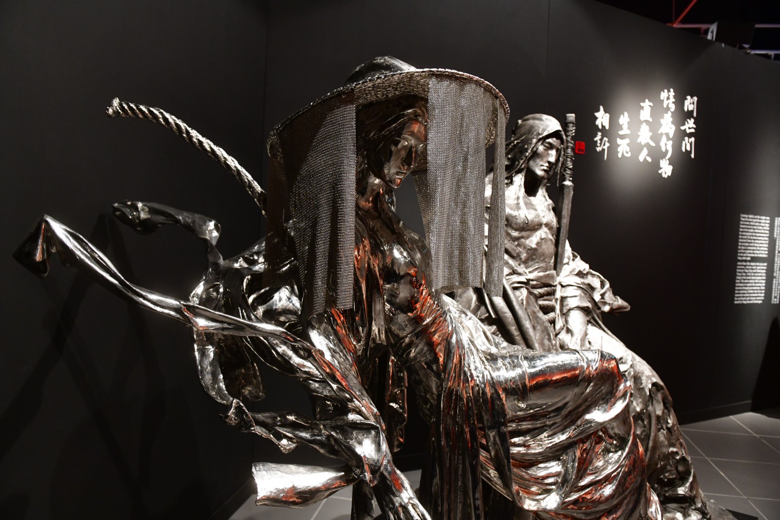 展覽的地下大堂展示任哲雕塑作品《張無忌》。