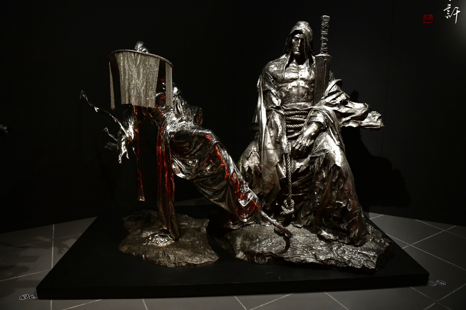 如展場一組楊過和小龍女雕像,楊過獨臂孤獨地抱劍的造型,雕塑的線條,包括衣服設計為向下的狀態(tài),以展示他黯然悲傷的神態(tài);小龍女輕臥繩上,頭戴輕紗與玉蜂為伴,通體白色的雕塑材質展現(xiàn)了小龍女仙氣飄逸、不經(jīng)世事的狀態(tài),巧妙對照抱劍深思的獨臂楊過。另一件雕像作品,東方不敗邪魅嬌艷,面容卻流露肅殺之氣,紅色衣袍迎風翻湧,藝術家特意選用青銅材質並加入紅色的媒材製作,以表達角色雌雄難辨的特質。