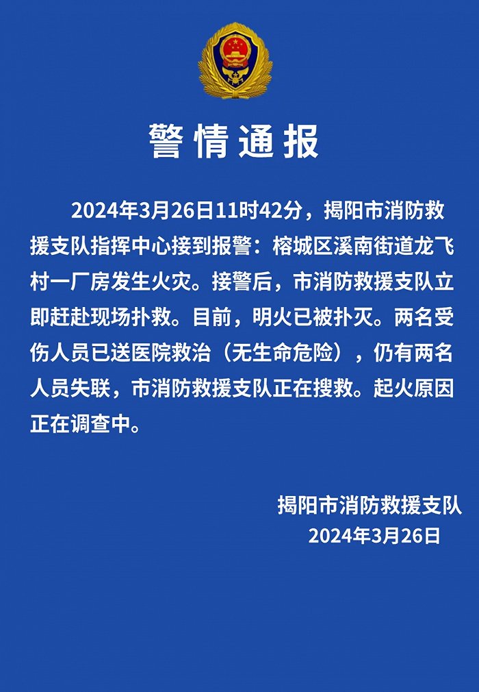 據(jù)「揭陽(yáng)發(fā)布」微信公眾號(hào)消息,揭陽(yáng)市消防救援支隊(duì)發(fā)布警情通報(bào),2024年3月26日11時(shí)42分,揭陽(yáng)市消防救援支隊(duì)指揮中心接到報(bào)警:榕城區(qū)溪南街道龍飛村一廠(chǎng)房發(fā)生火災(zāi)。接警後,市消防救援支隊(duì)立即趕赴現(xiàn)場(chǎng)撲救。目前,明火已被撲滅。兩名受傷人員已送醫(yī)院救治(無(wú)生命危險(xiǎn)),仍有兩名人員失聯(lián),市消防救援支隊(duì)正在搜救。起火原因正在調(diào)查中。