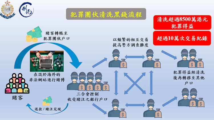 新界南總區(qū)反三合會(huì)行動(dòng)組總督察劉煜華表示,警方人員由2023年9月開(kāi)始調(diào)查,發(fā)現(xiàn)一個(gè)由黑社會(huì)團(tuán)夥控制的洗黑錢(qián)集團(tuán),利用虛擬銀行戶(hù)口處理海外非法賭博網(wǎng)站賭注和清洗犯罪得益。集團(tuán)透過(guò)即時(shí)通訊軟件、社交媒體、甚至在非法賭檔內(nèi)招攬賭客,聲稱(chēng)可以提供網(wǎng)上賭博,如麻雀、撲克和百家樂(lè)。