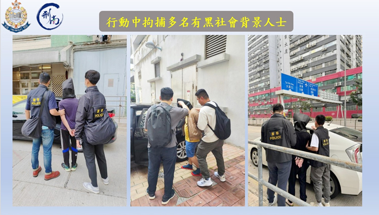 新界南總區(qū)刑事部警司李木易表示,在同一時(shí)間新界南總區(qū)聯(lián)同各分區(qū)動(dòng)員400多名警員於25至27日展開(kāi)「犁庭掃穴」大型反黑社會(huì)行動(dòng),共拘捕82名人士,分別62男20女(14至83歲),涉嫌自稱(chēng)三合會(huì)成員、販運(yùn)危險(xiǎn)藥物、藏毒、傷人、意圖搶劫而襲擊、非法禁錮、以欺騙手段取得財(cái)產(chǎn)、洗黑錢(qián)、使用偽鈔、經(jīng)營(yíng)賭博場(chǎng)所、在賭博場(chǎng)所內(nèi)賭博、刑事毀壞及刑事恐嚇等罪。
