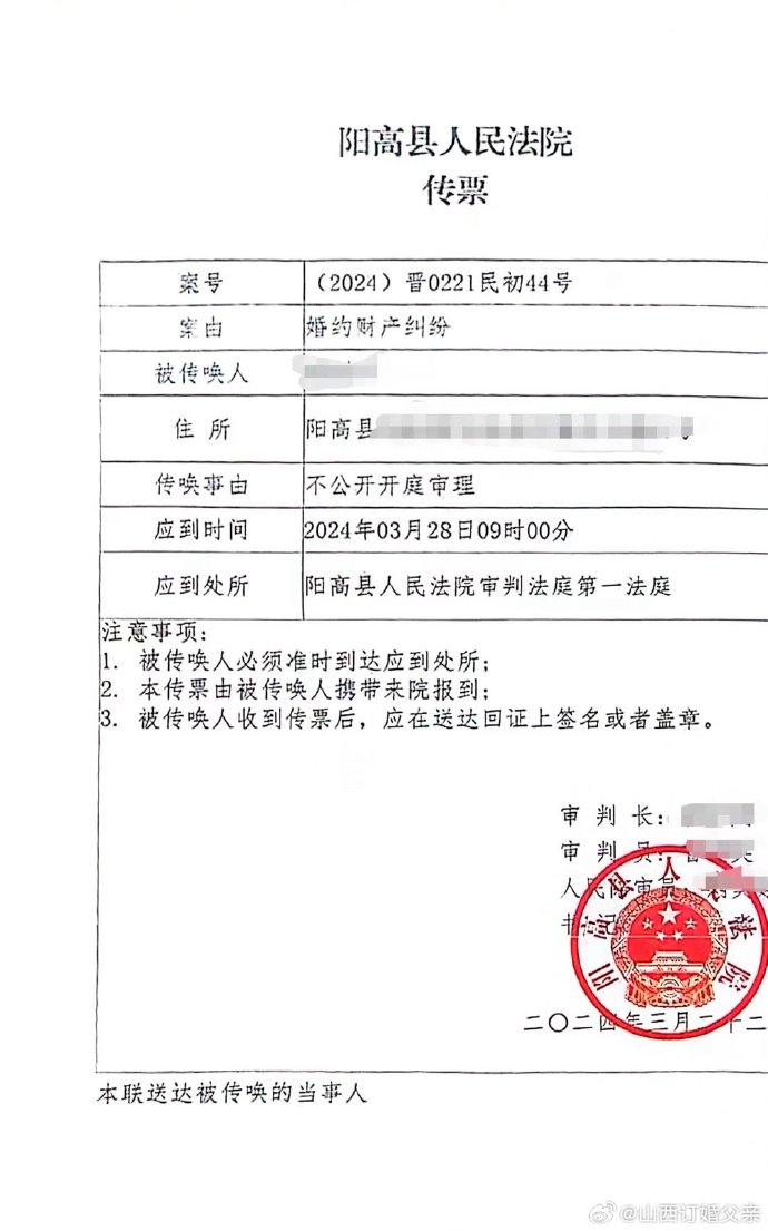 據(jù)陽高縣融媒體中心 微信公眾號「和陽高」消息,3月28日,陽高縣人民法院一審審理並當(dāng)庭宣判一起婚約財產(chǎn)糾紛案件,依法判決駁回原告的訴訟請求。