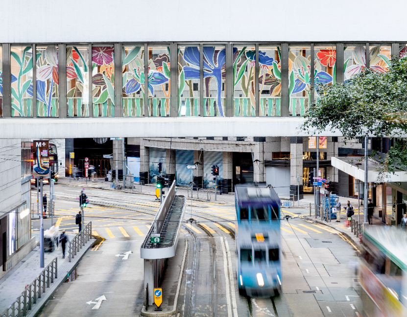 路經(jīng)香港中環(huán)的訪客看到這個(gè)裝置可感受到藝術(shù)家筆下的園圃與周邊景色不一樣的色彩。