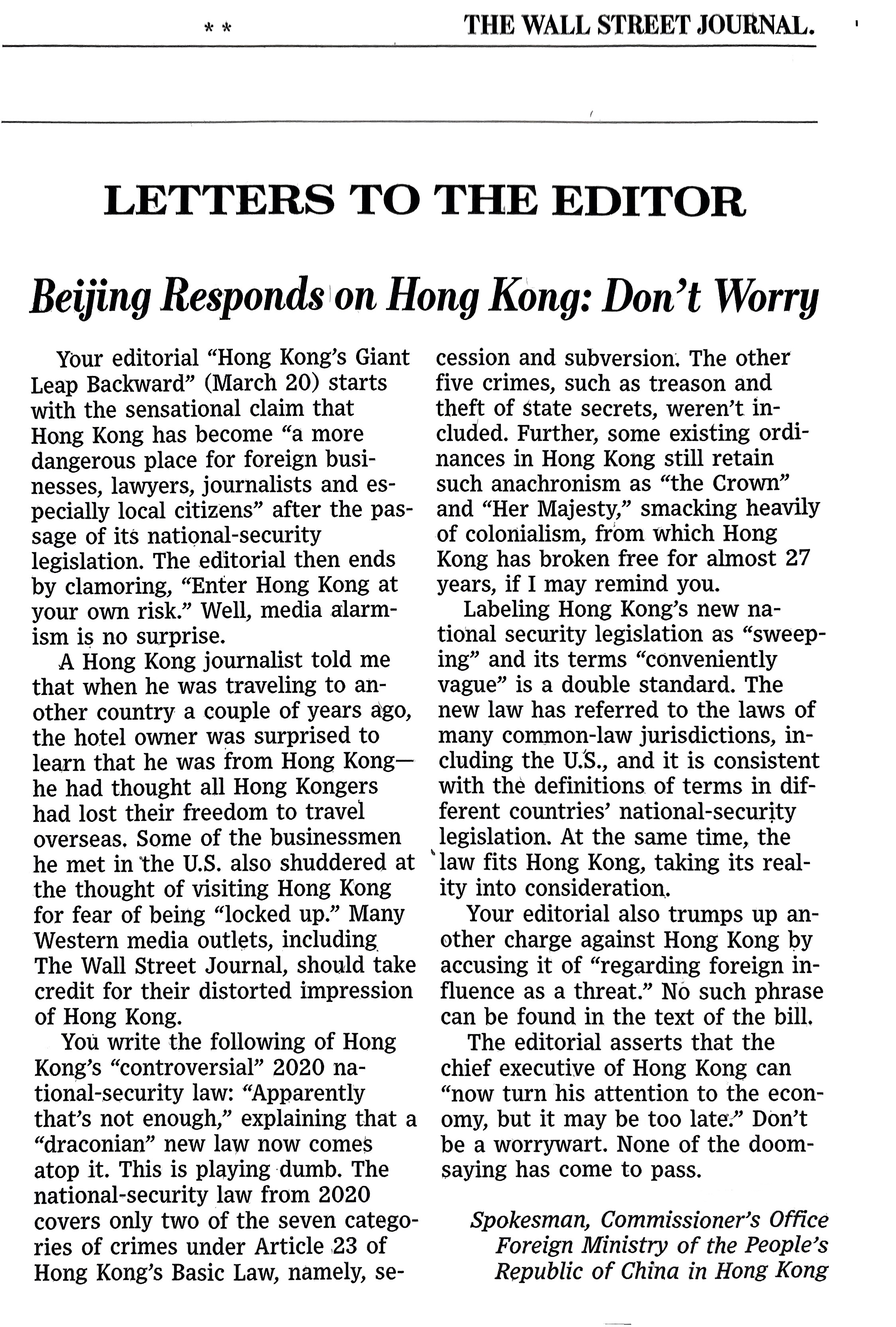 據(jù)外交部駐港公署官網(wǎng)29日消息,《華爾街日報》昨日(28日)刊登外交部駐港公署發(fā)言人致該報信函。信函駁斥《華爾街日報》社論日前抹黑香港《維護國家安全條例》、唱衰香港發(fā)展前景的惡劣言論,闡明香港基本法第23條立法的必要性、重要性和正當(dāng)性。