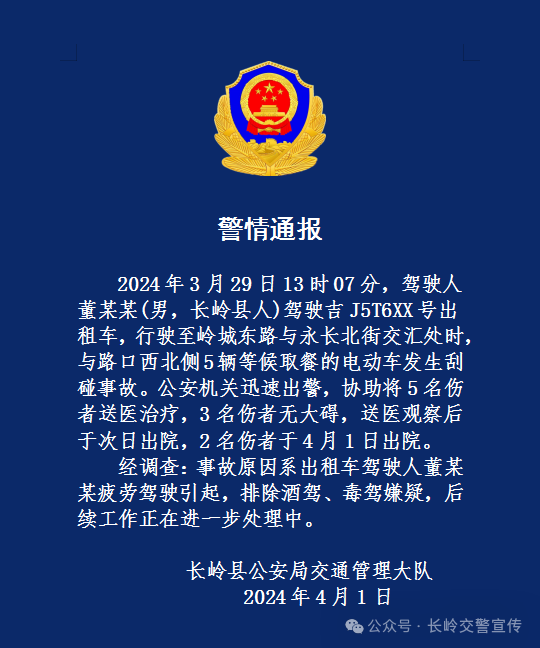 通報稱,2024年3月29日13時07分,吉林松原長嶺,駕駛?cè)硕衬绸{駛吉J5T6XX號出租車,行駛至嶺城東路與永長北街交匯處時,與路口西北側(cè)5輛等候取餐的電動車發(fā)生刮碰事故。公安機關(guān)迅速出警,協(xié)助將5名傷者送醫(yī)治療,3名傷者無大礙,送醫(yī)觀察後於次日出院,2名傷者於4月1日出院。