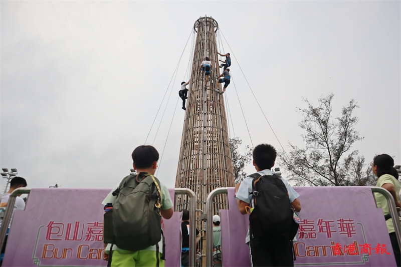 長洲太平清醮是香港一年一度的盛事,其中重頭戲搶包山活動將於5月15日晚上於洲北帝廟遊樂場足球場舉行決賽,今日(7日)進行賽前訓(xùn)練。今年共有236名參加者報名,共140男96女。所有參賽者必須完成訓(xùn)練才可進入選拔賽,將選出24人入圍復(fù)賽,爭奪12個決賽席位(其中三席必須是女參賽者)。男子組冠、亞、季軍及女子組冠軍均可獲頒獎座;而在指定時間內(nèi)取得最多個平安包的參賽者將可奪得「代代平安獎」。由2016年起,累積取得任何三屆比賽冠軍的男女健兒,將成為搶包山比賽「王中王」或「后中后」寶座的得主。決賽將於佛誕當(dāng)晚舉行。(馮瀚文攝)