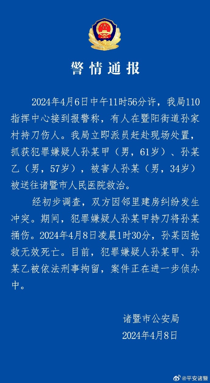 4月8日,浙江諸暨市公安局通報:4月6日中午11時56分許,我局110指揮中心接到報警稱,有人在暨陽街道孫家村持刀傷人。我局立即派員趕赴現(xiàn)場處置,抓獲犯罪嫌疑人孫某甲(男,61歲)、孫某乙(男,57歲),被害人孫某(男,34歲)被送往諸暨市人民醫(yī)院救治。經(jīng)初步調(diào)查,雙方因鄰里建房糾紛發(fā)生衝突。期間,犯罪嫌疑人孫某甲持刀將孫某捅傷。2024年4月8日凌晨1時30分,孫某因搶救無效死亡。目前,犯罪嫌疑人孫某甲、孫某乙被依法刑事拘留,案件正在進一步偵辦中。