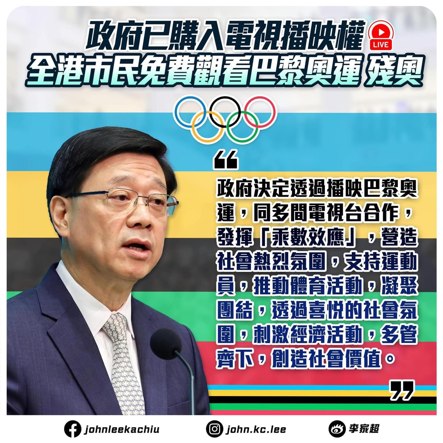 他又說,購買播映權(quán)合約設(shè)有保密條款,政府不能披露金額,但費用低於過往所付,包括東京奧運的播映權(quán)和過往商業(yè)機(jī)構(gòu)所投得的播映權(quán), 費用合理,物有所值。