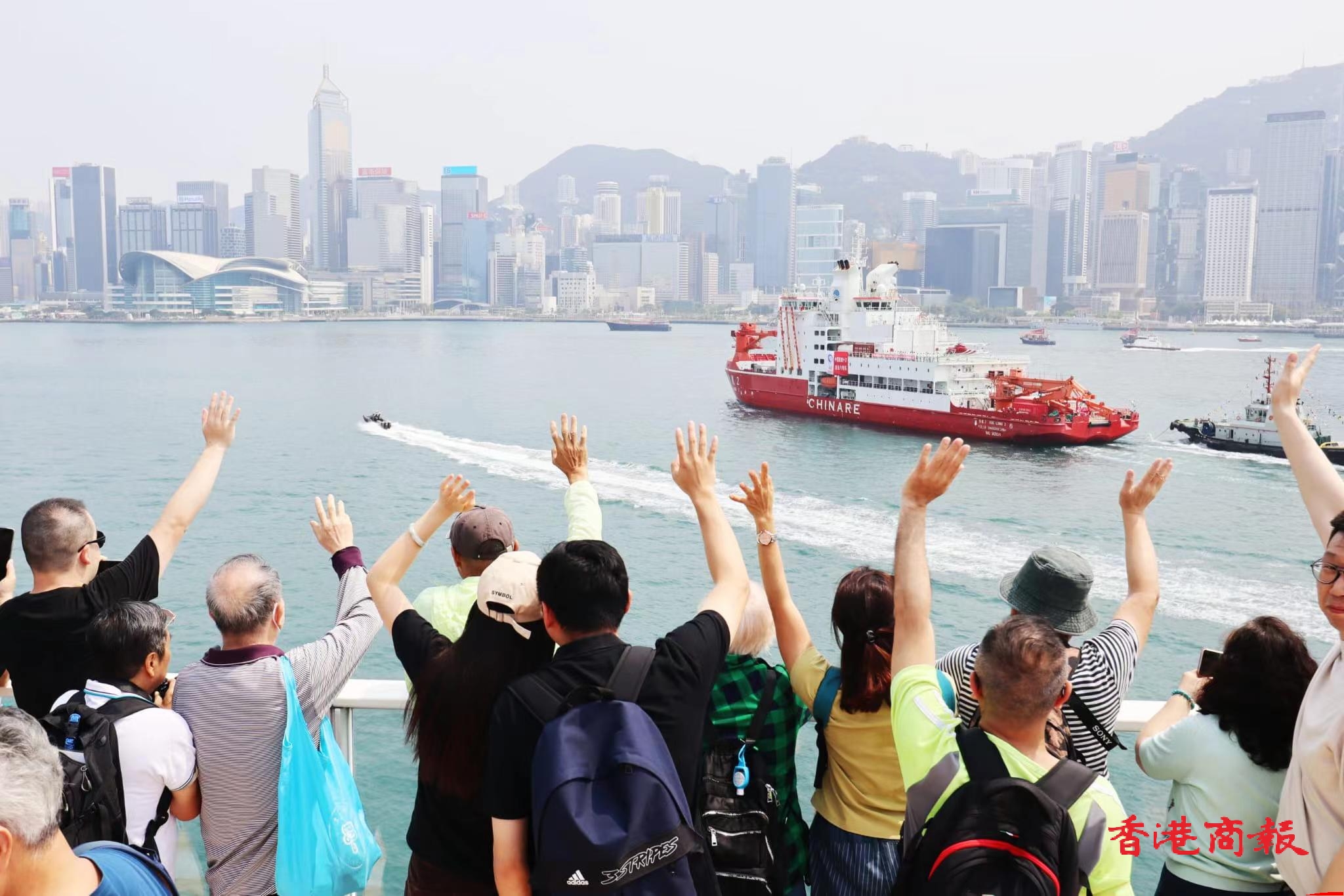 尖沙咀海運(yùn)大廈碼頭平臺(tái)有近半百市民、遊客揮手歡送「雪龍2」號(hào)。
