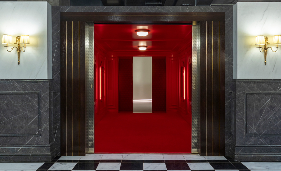 品牌Ancora系列展覽復(fù)刻版的升降機(jī)沿用酒店原版的全紅色設(shè)計(jì)。