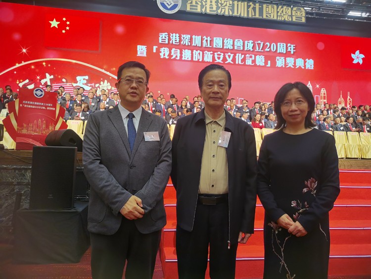 香港商報(bào)副總編輯王軍(左)、深圳市民間文藝家協(xié)會(huì)名譽(yù)主席、文史研究學(xué)者楊宏海(中)、深圳市史志辦地方志處處長(zhǎng)周華赴港出席香港「我身邊的新安文化記憶」頒獎(jiǎng)典禮。