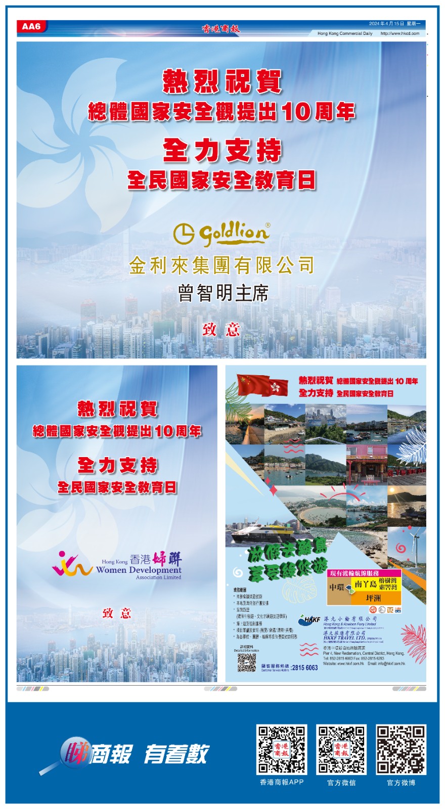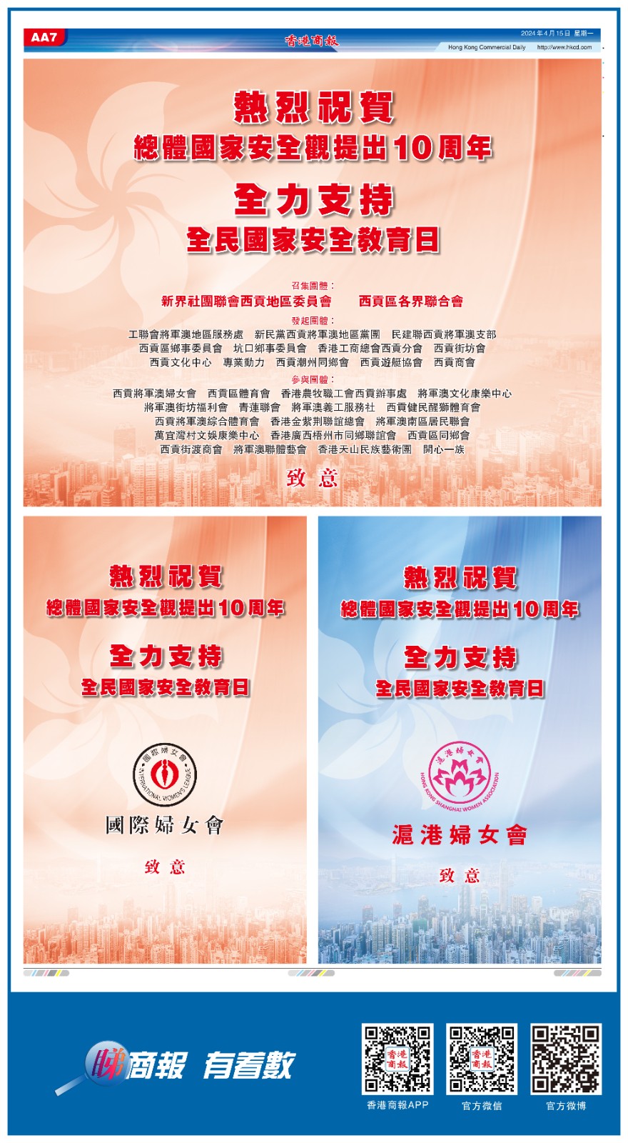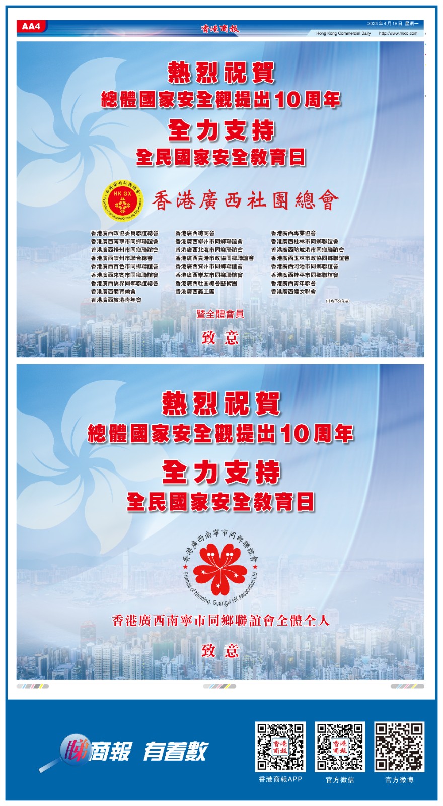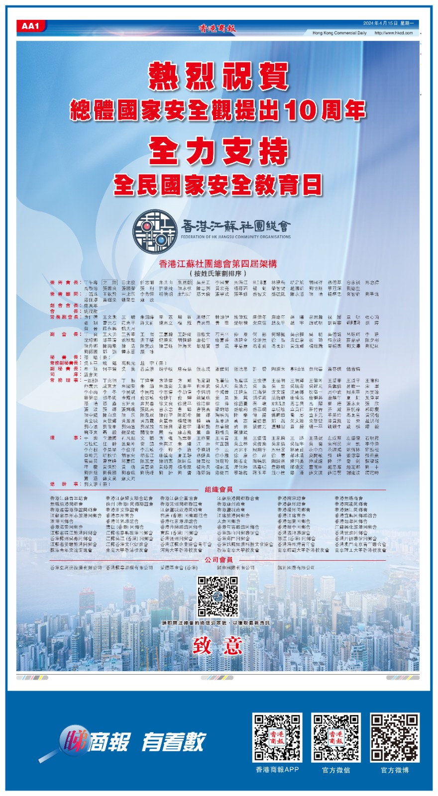 除頭版外,香港商報今天推出十餘個版面,來自香港各行各業(yè)的企業(yè)、社團,紛紛登報,慶??傮w國家安全觀提出10周年,並全力支持「全民國家安全教育日」!一起來睇睇↓