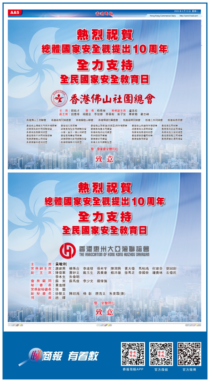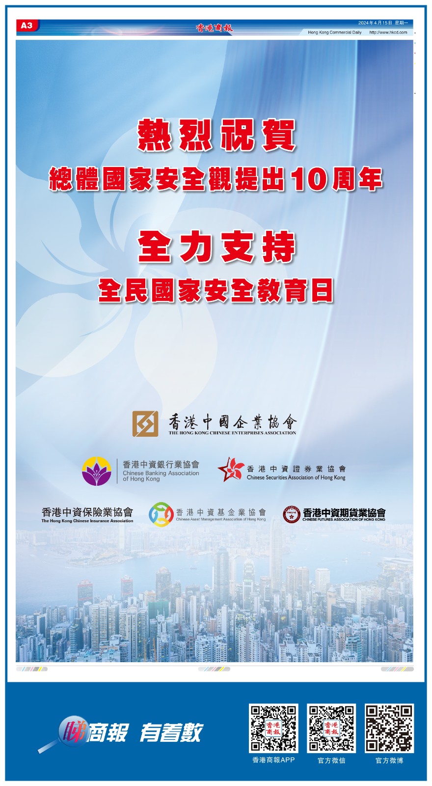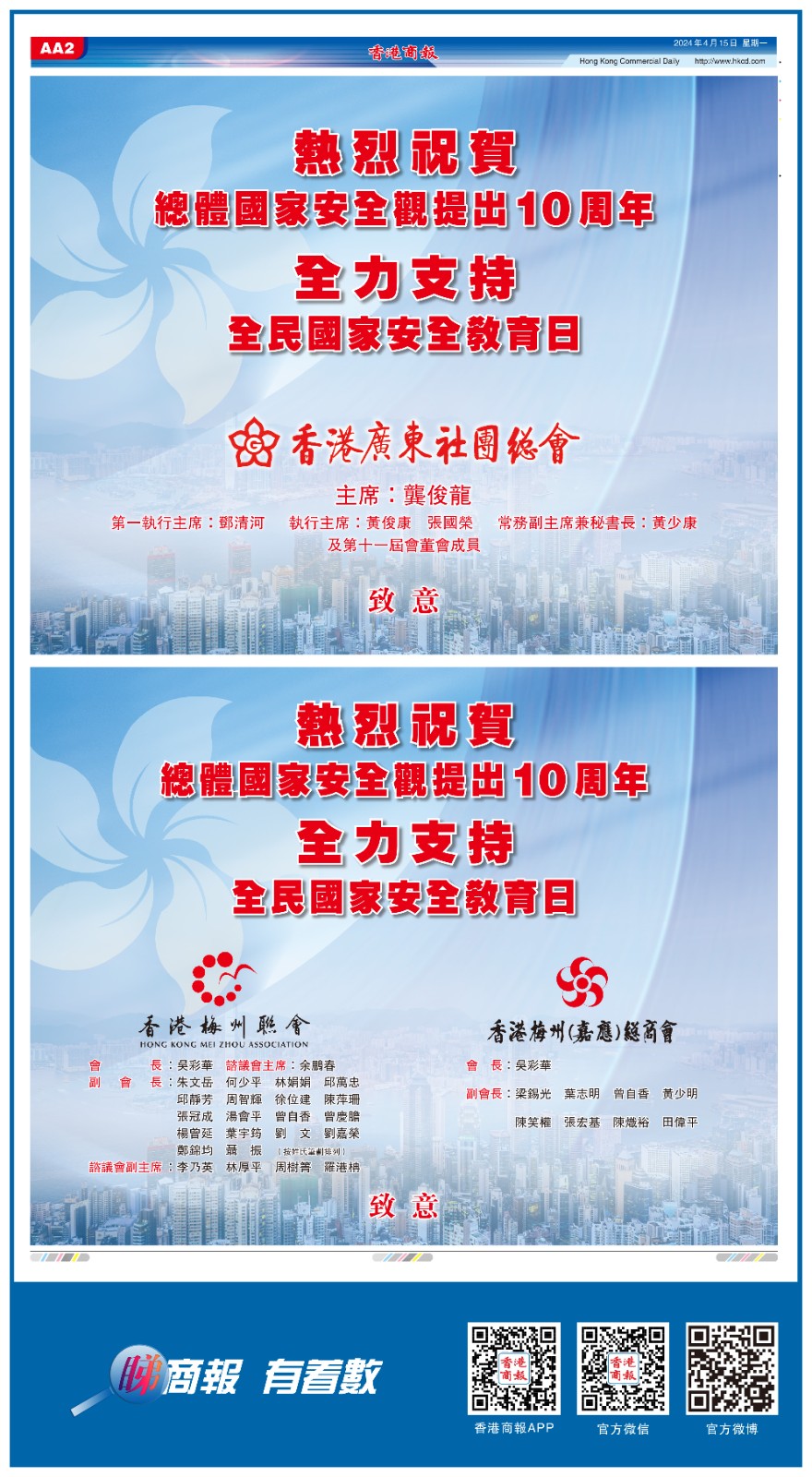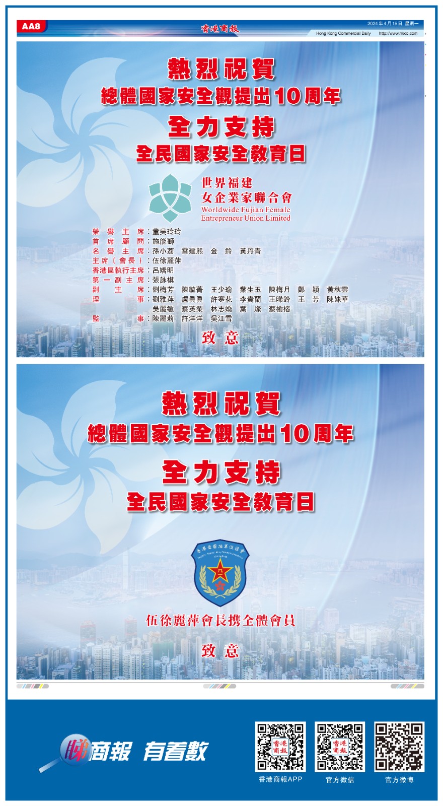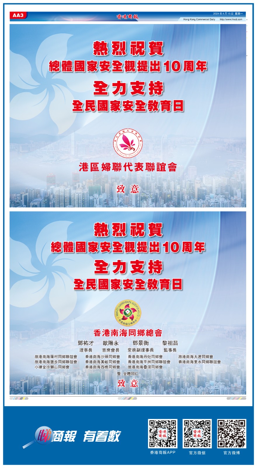除頭版外,香港商報今天推出十餘個版面,來自香港各行各業(yè)的企業(yè)、社團,紛紛登報,慶??傮w國家安全觀提出10周年,並全力支持「全民國家安全教育日」!一起來睇睇↓