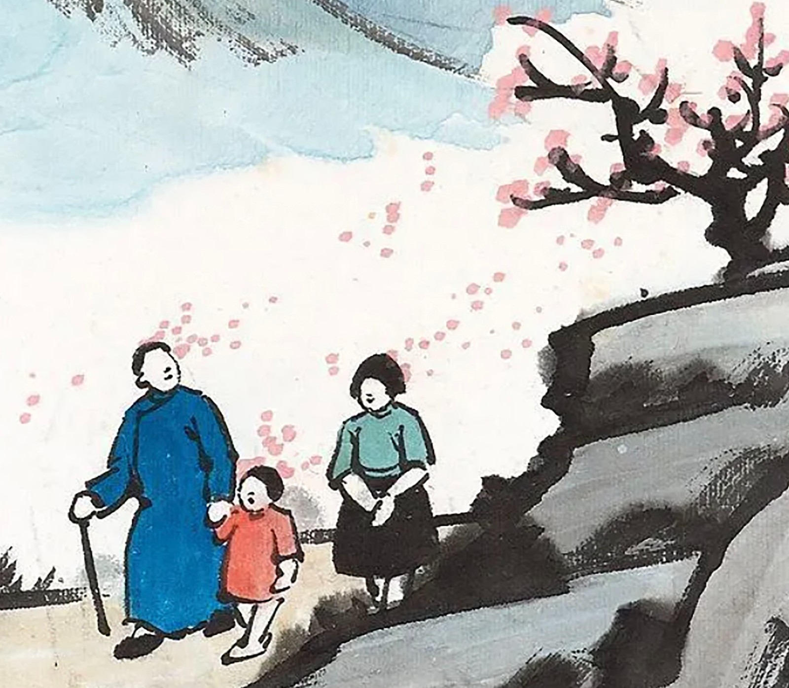 此畫以「春日遊」為題,充滿了生活的情趣。一家三口攜手走在山間小道上,正值花紅柳綠時(shí)節(jié),春日的美好與家人之間的溫情躍然紙上。豐子愷的繪畫通常以單線平塗,用筆流暢,線條簡(jiǎn)練。他的作品中很少繪製五官的表情,而是留白,通過(guò)人物的動(dòng)作來(lái)表現(xiàn)心理活動(dòng),引人思索,這成為了其人物畫的一大特色。畫中的三人神情各異,父親牽著女兒,抬頭看著盛開的桃花,嘴角似乎帶著笑容;女兒望向前方,彷彿好奇地詢問(wèn)眼前所見的一切;母親雙手交疊在身前,低頭看著女兒,彷彿能透過(guò)畫面感受到慈愛的目光。儘管筆墨不多,但其中的細(xì)節(jié)值得反覆品讀,令人回味。