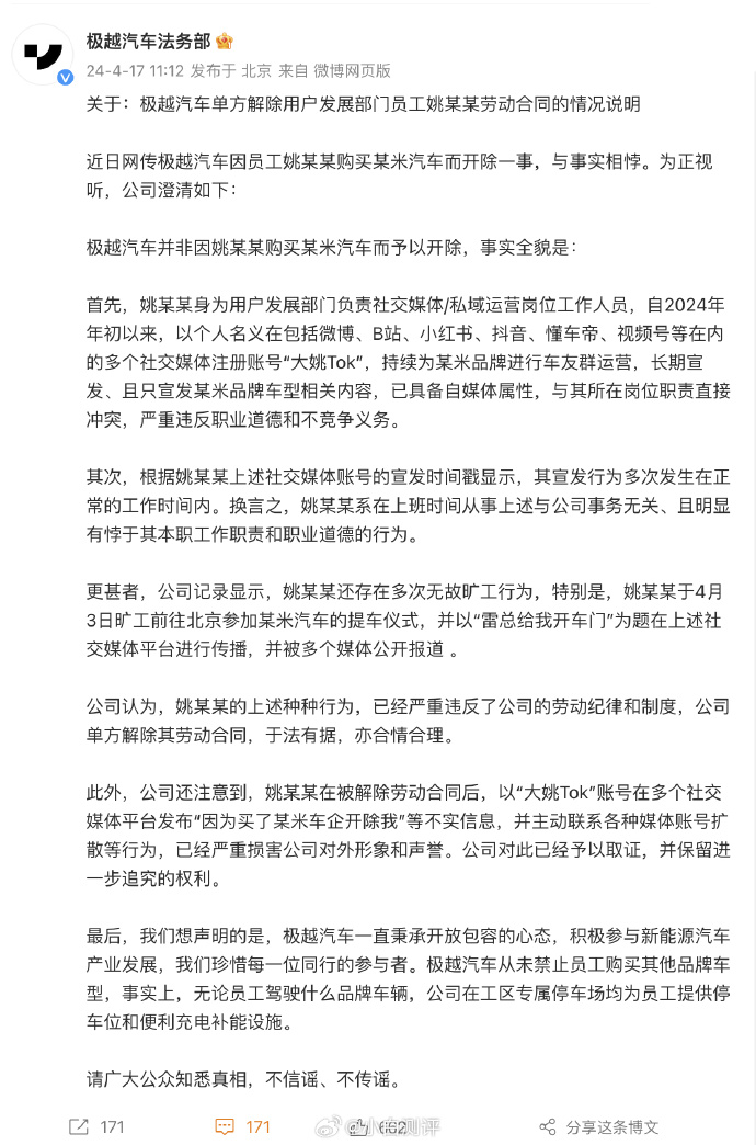 員工購(gòu)買小米SU7被辭退?極越汽車回應(yīng)