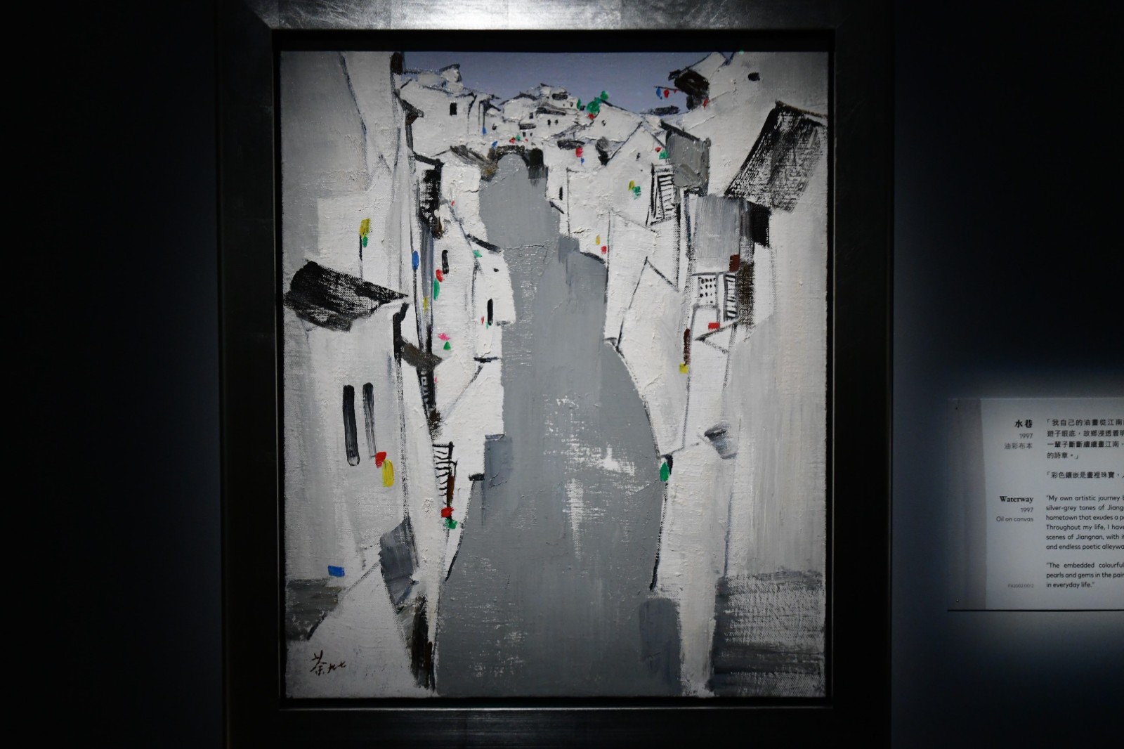 灰色作為黑與白之間的過渡色,令人覺得不起眼、甚至負(fù)面。吳冠中就認(rèn)為灰色擁有無窮生命,甚至成為其經(jīng)典作的「主角」。鍾館長表示:「一片黑瓦白牆的民居在淺灰色調(diào)的水鄉(xiāng)世界尤為奪目,如展品《水巷》,令人感覺柔和、舒服,並無強烈的對比感。畫中並加入了彩點,注入了活潑的節(jié)奏感?!箙鞘显绱簳r喜愛到江南地區(qū)寫生,在陰天時遠(yuǎn)看尚未冒芽的枝椏和苗圃,呈現(xiàn)半透明的冷灰色,寧靜而和諧?;疑韰枪谥袑枢l(xiāng)的思念,他的油畫是從江南的灰調(diào)起步,既是大膽創(chuàng)新的嘗試,也打破當(dāng)時蘇聯(lián)畫家認(rèn)為江南景色不宜作油畫的說法,對其獨特意義不言而喻。