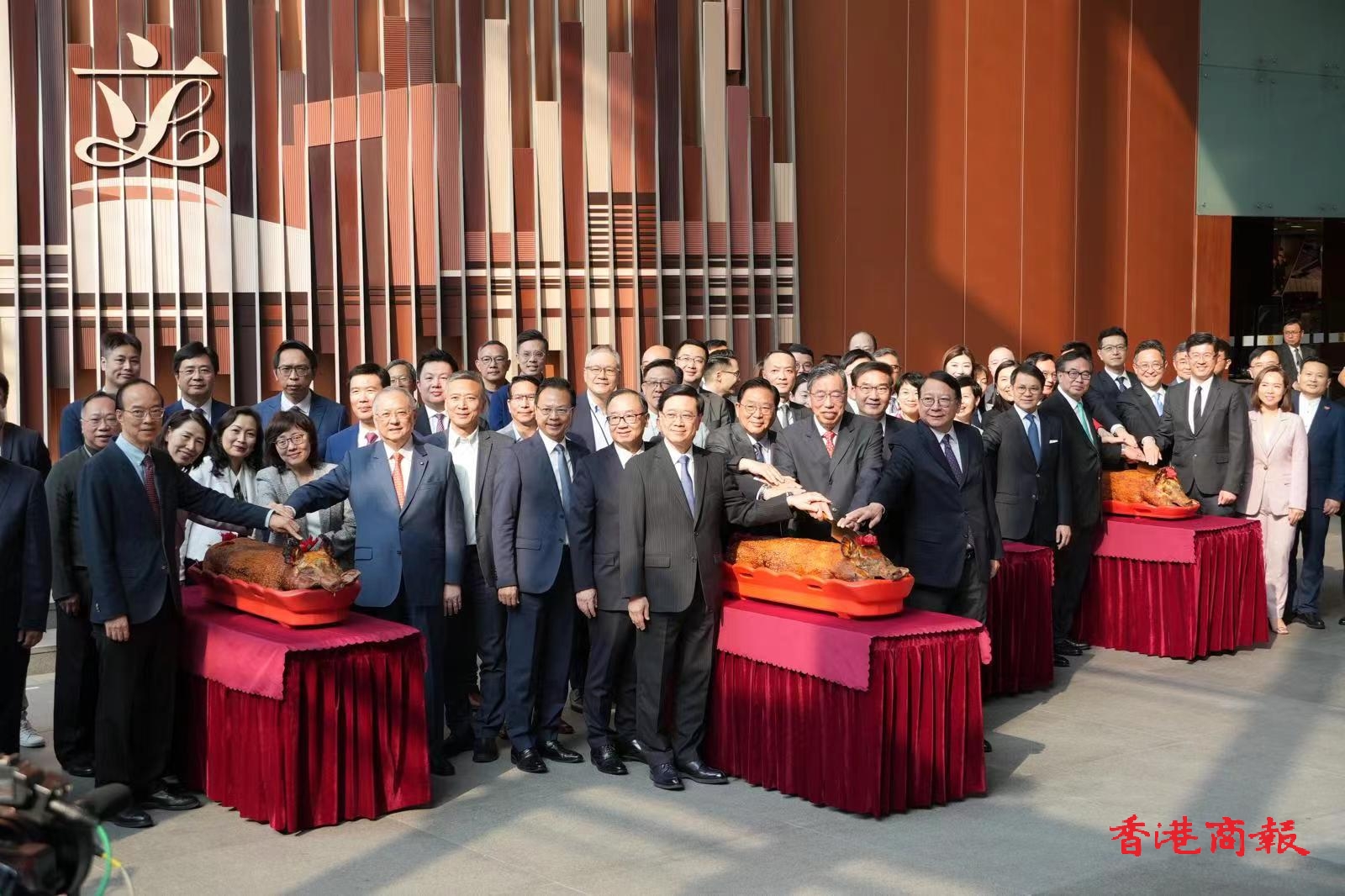 在平頂儀式上,李家超與官員及梁君彥、行管會成員將22個議員辦公室MiC模型放在擴建後的大樓模型裝置上,即時持續(xù)展示耀眼彩光,寓意立法會五光十色,生生不息。之後眾人一齊按傳統(tǒng)切燒豬,並一口氣分工合作切5隻燒豬,一切切到尾,寓意擴建工程大吉大利,香港五福臨門。